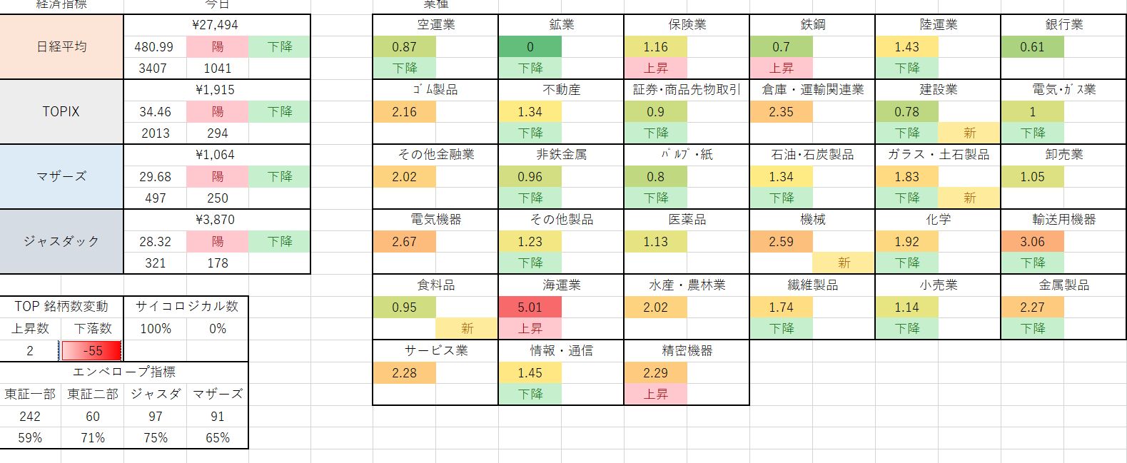 ③業種別 個別銘柄推移 における多くの業種が赤点灯(みんなで稼ごう指標)