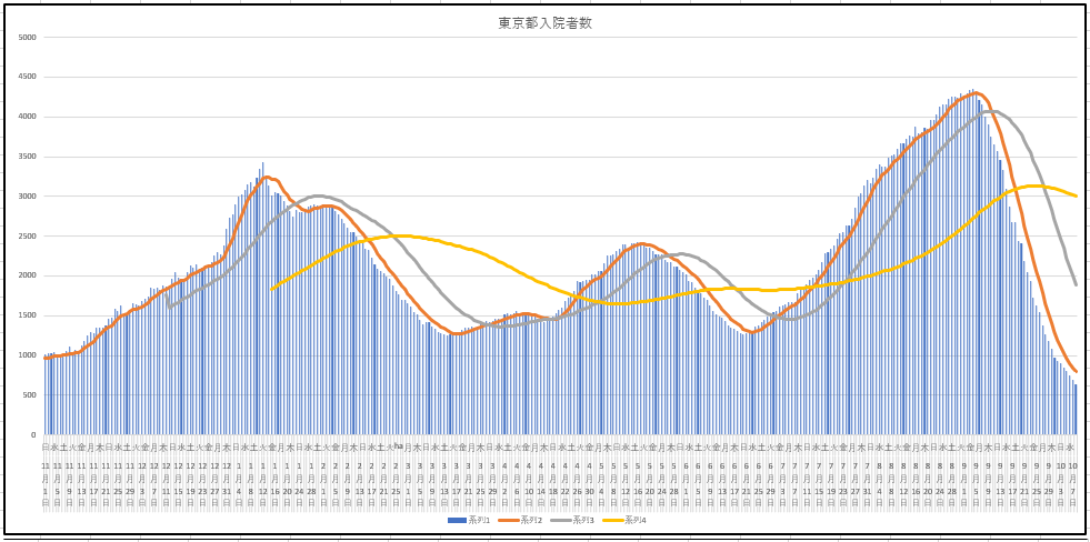 ひさしぶりに東京都の新規感染、入院者数、重症者数の推移を