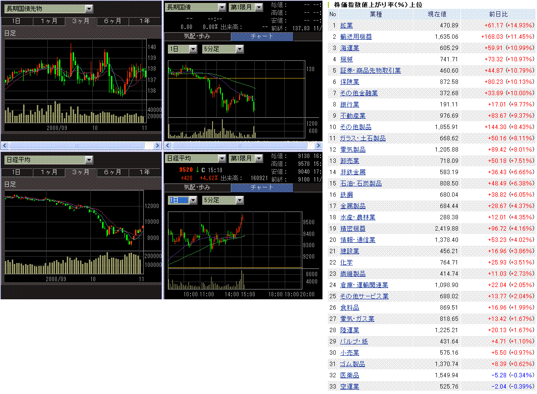 米株は大幅続伸。原油高により資源関連銘柄が買われました。銀行以外の金融機関にも政府が公的資金の注入を検討しているとの報道により、モノラインや保険株が買われ、銀行株も全体的に高かったです。新大統領誕生のご祝儀相場や、年末ラリーへの期待という面もあったようです。金融不安関連のニュースもいったん途絶えたし、経済指標がどんなに悪くても下がらないなら、買うしかないって感じになっていますね。