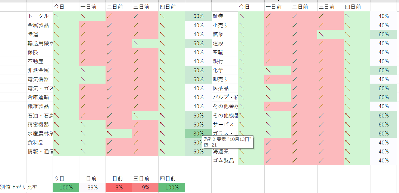写真1枚目上の色がついているものが値上がり銘柄数を表します。