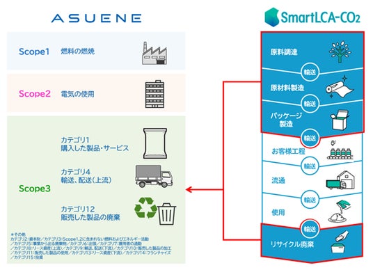 プライム上場企業における2026年からのScope3(※1)の開示義務化により、CO2の企業排出量(Scope1,2,3)の算定が喫緊の課題となっていますが、その中でもカテゴリ1(原材料/購入した製品・サービス)の算定は企業の大きな負担になっています。今回のシステム連携により、CO2排出量見える化・削減・報告クラウドサービス「ASUENE」に、パッケージに特化したCO2排出量算定クラウドサービス「SmartLCA-CO2(R)」での算定結果を連携でき、Scope3の可視化に向けより効率的なオペレーションを実現します。