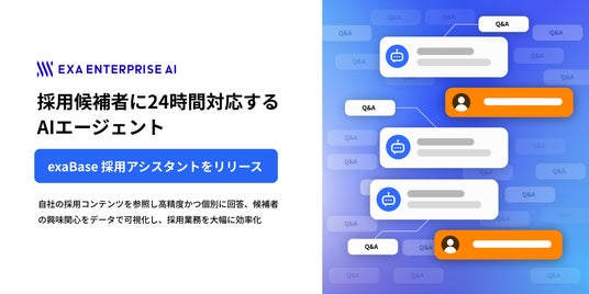 株式会社エクサウィザーズ(東京都港区、代表取締役社長 CEO︓春田 真、以下エクサウィザーズ)のグループ会社である株式会社 Exa Enterprise AI(東京都港区、代表取締役︓大植択真、以下 Exa Enterprise AI)は、「exaBase 採用アシスタント」(以下本サービス)を 2025 年 6 月にリリースすることをお知らせいたします。本サービス内の AI エージェントが 24 時間 365 日候補者からの問い合わせに対応し、採用業務の大幅な効率化を支援します。公開済みの情報をベースとして個別に回答を生成するため、柔軟かつ高精度な回答が可能であることが特徴です。候補者の入力情報から「知りたいこと」を可視化し、データに基づいた採用戦略を可能にします。