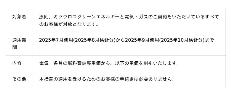 株式会社ミツウロコグループホールディングス連結子会社であるミツウロコグリーンエネルギー株式会社(本社:東京都中央区、代表取締役社長:坂西 学、以下、「ミツウロコグリーンエネルギー」)は、国の電気・ガス価格激変緩和対策事業(以下、本事業)に参画しており、令和7年4月22日の内閣総理大臣記者会見において、2025年7月使用(2025年8月検針分)から2025年9月使用(2025年10月検針分)までの電気・ガス料金支援を実施する旨の発表がありましたので、電気・都市ガス料金の値引きを以下のとおり実施いたします。
