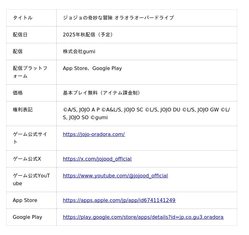 ※本情報の掲載及び画像掲載の際は、コピーライト「(C)A/S, JOJO A P (C)A&L/S, JOJO SC (C)L/S, JOJO DU (C)L/S, JOJO GW (C)L/S, JOJO SO @gumi」の表記をお願いいたします。