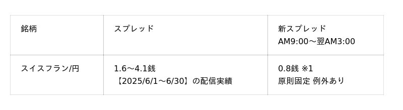 ヒロセ通商株式会社 (本社:大阪府西区、代表取締役:野市 裕作)は、2025年8月4日(月)AM9:00より、「LION FX」におけるスイスフラン/円のスプレッドが1.6~4.1銭から、AM9:00~翌AM3:00の時間帯で0.8銭 原則固定(例外あり)※1に縮小となりますので、お知らせいたします。