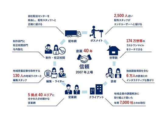 当社は、地域密着型の生活情報誌『ちいき新聞』の発行を軸に、情報発信および販売促進の総合支援事業を展開しており、年間約7,000社にサービスを提供しています。千葉県を中心に毎週発行している『ちいき新聞』は、専属の配布員により174万世帯へポスティングされ、創業以来40年以上にわたり配布を継続してきたことで、他に類を見ない9つのアセットを築いてきました。