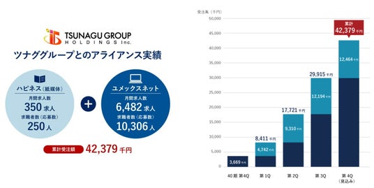 ツナググループは、WEB 媒体を主軸に千葉県内で年間 6,000 社の求人を取り扱う一方、当社は紙媒体を軸として千葉県を中心に年間 7,000 社と取引を行っております。両社の強みを生かした連携のもと、当社の発行する紙媒体『ハピネス』と、ツナググループのWEB 媒体『ユメックスネット』の売上は、契約締結後の2024年8月から2025年8月までの累計で42,379千円を達成いたしました。今後も、ツナググループが持つ採用課題解決力と、当社の営業ネットワークおよび取材・編集力を活かし、連携をさらに強化してまいります。これにより、地域の雇用促進を支援するとともに、人材ビジネスのさらなる成長を目指してまいります。