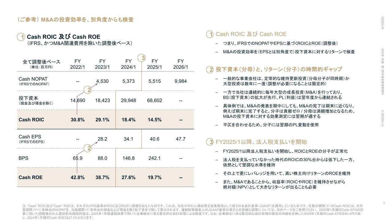 回答:2025年1月期以降法人税支払いを開始し、ROICとROEの分子が正常化しました。法人税を支払っていなかった時代のROICの30パーセント台からは低下した一方、依然として堅調な水準を維持しています。