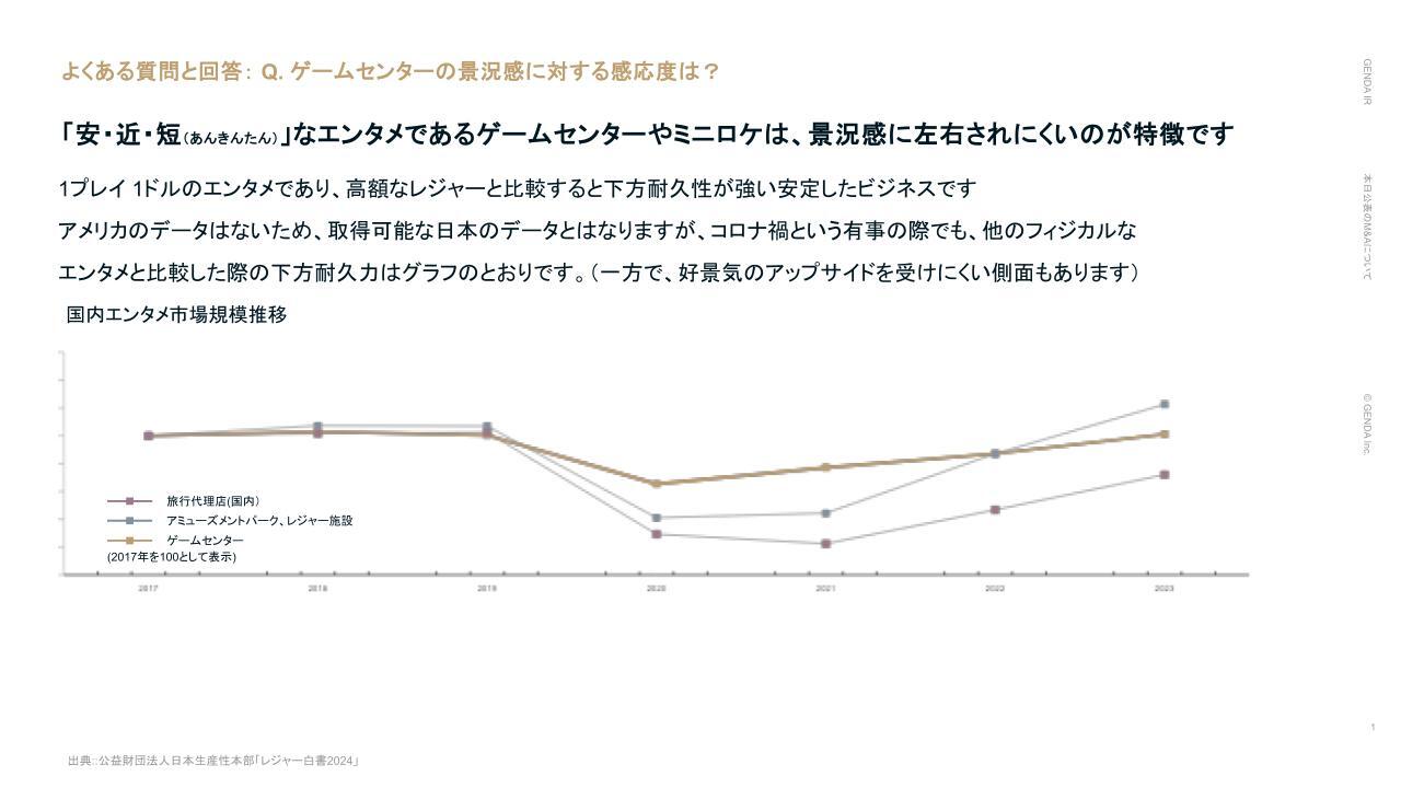 回答:「安・近・短(あんきんたん)」なエンタメであるゲームセンターやミニロケは、景況感に左右されにくいのが特徴です。1プレイ1ドルのエンタメであり、高額なレジャーと比較すると下方耐久性が強い安定したビジネスです。