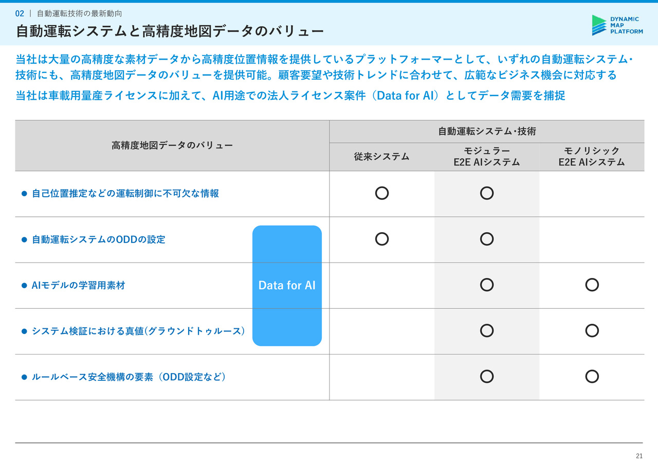 そのような中で当社のデータが利用されていくことが、スライド21ページに記載したとおり、「Data for AI」と呼称しているサービスになります。
