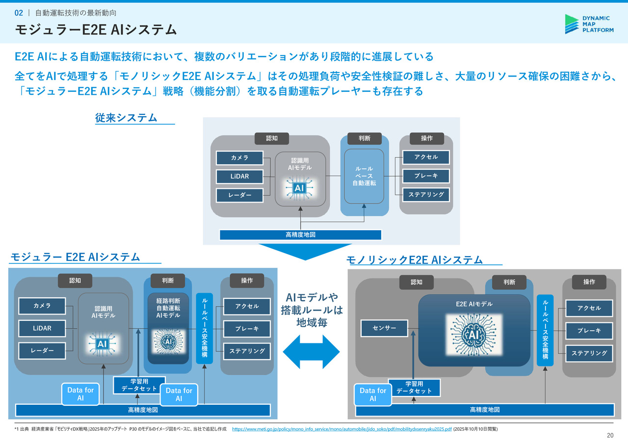 先ほどのスライドで説明したEnd-to-End AIは、このスライド右下に示されているモデル「モノリシックE2E AIシステム」に該当します。このモデルは、センサから得られるインプット情報を単一のAIモデルで処理し、車両の挙動をコントロールするシステムです。