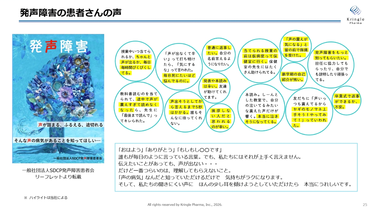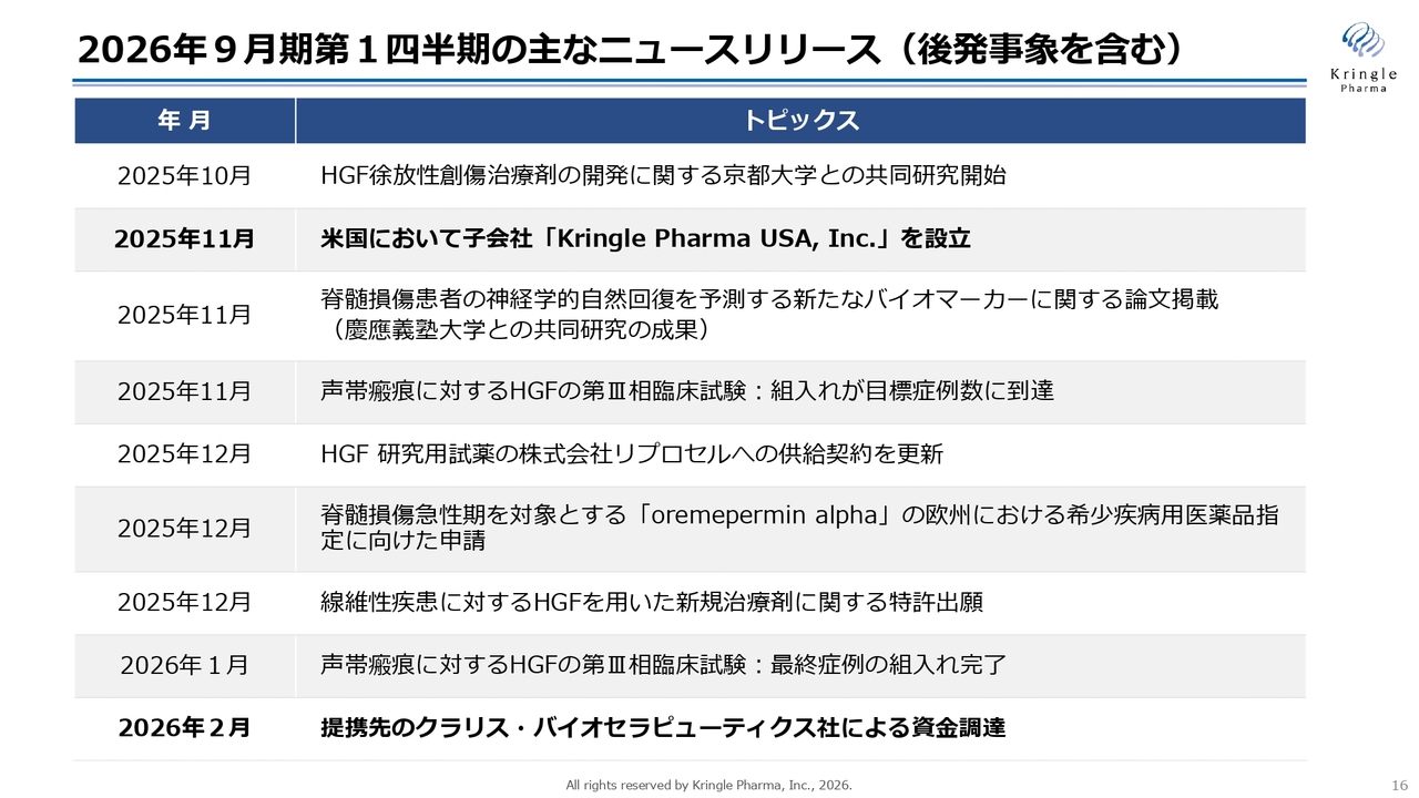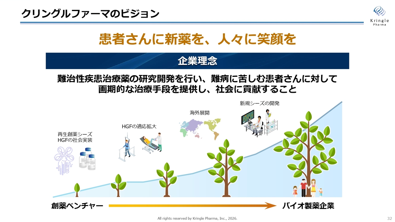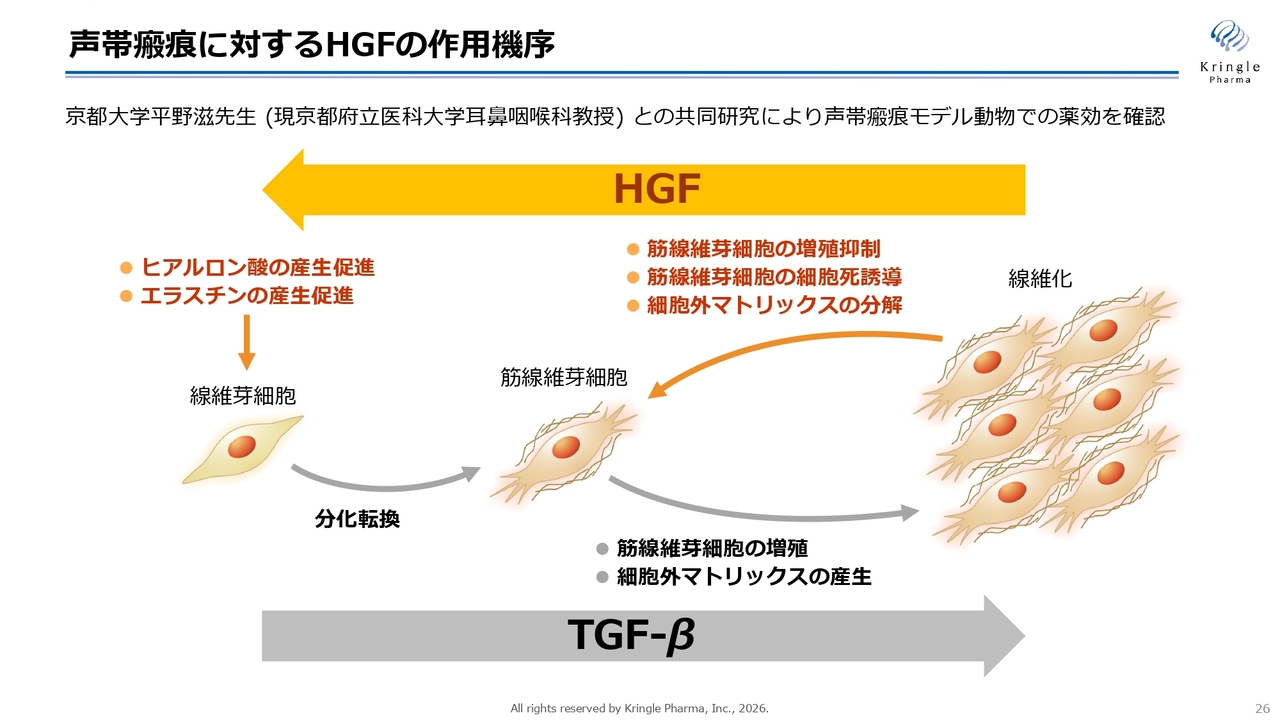 また、昨年11月には、米国に子会社Kringle Pharma USAを設立しました。同じく11月には、慶應義塾大学との共同研究の成果として、脊髄損傷の自然回復を予測する新たなバイオマーカーに関する論文が掲載されました。さらに、声帯瘢痕を対象とした第Ⅲ相試験で、組入れが目標症例数に到達し、今年1月には最終症例の組入れを完了しました。