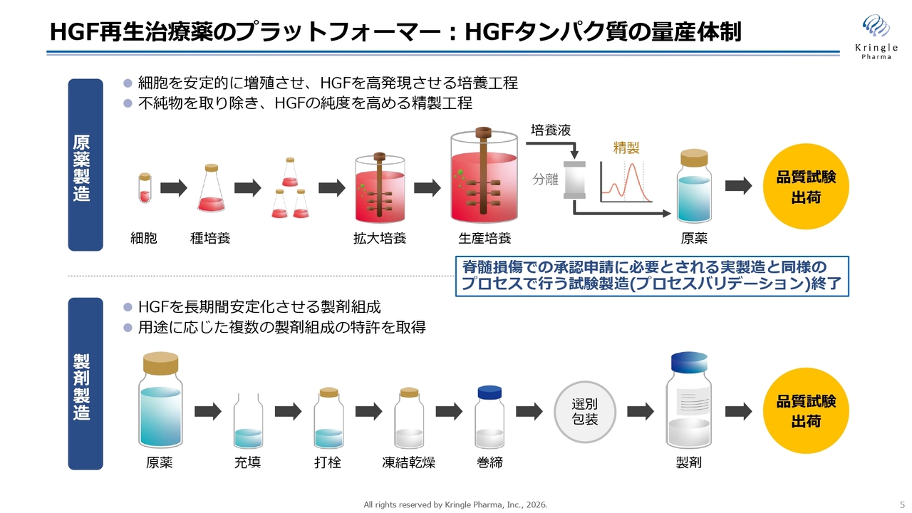 なお当社は、脊髄損傷における承認申請に必要とされる、実製造と同様のプロセスで実施する試験製造(プロセスバリデーション)もすでに終了しており、承認後の商業製造の体制も整えています。
