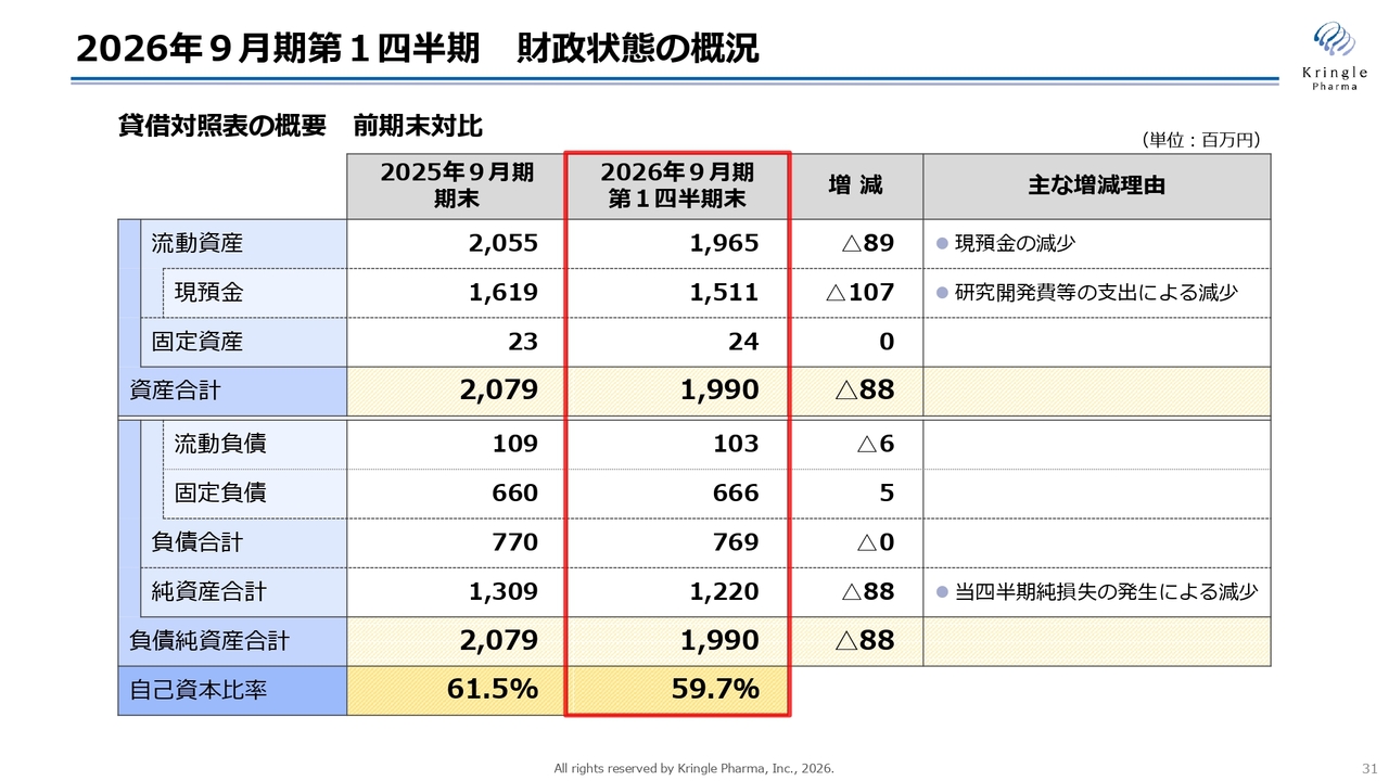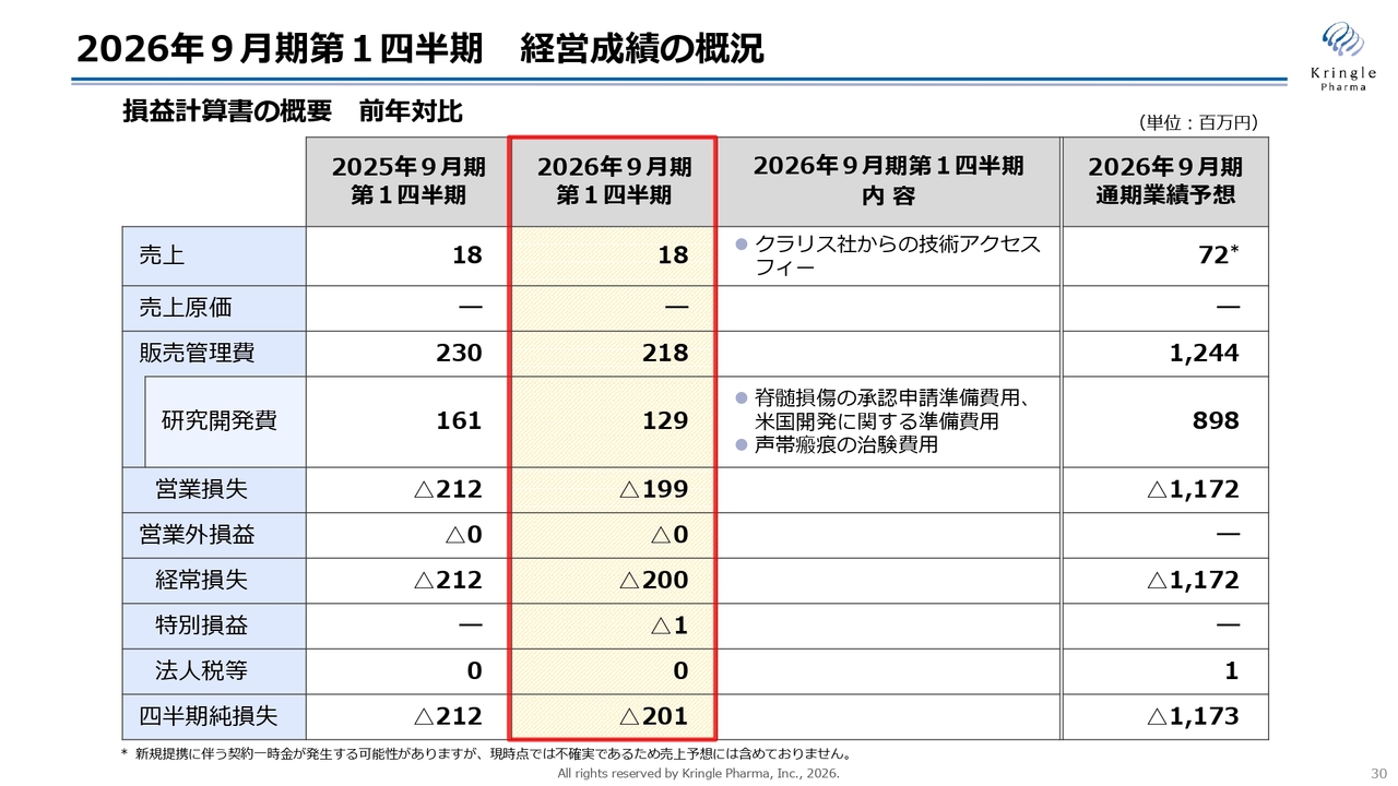 最後に、2026年9月期第1四半期の決算概況についてご説明します。スライドには、損益計算書の概要を前年比でお示ししています。当第1四半期では、クラリス社からの技術アクセスフィーとして1,800万円を計上しました。販売管理費は2億1,800万円で、そのうち研究開発費は1億2,900万円となっています。内訳は、脊髄損傷の承認申請準備費用、米国開発に関する準備費用、声帯瘢痕の第Ⅲ相試験の費用です。