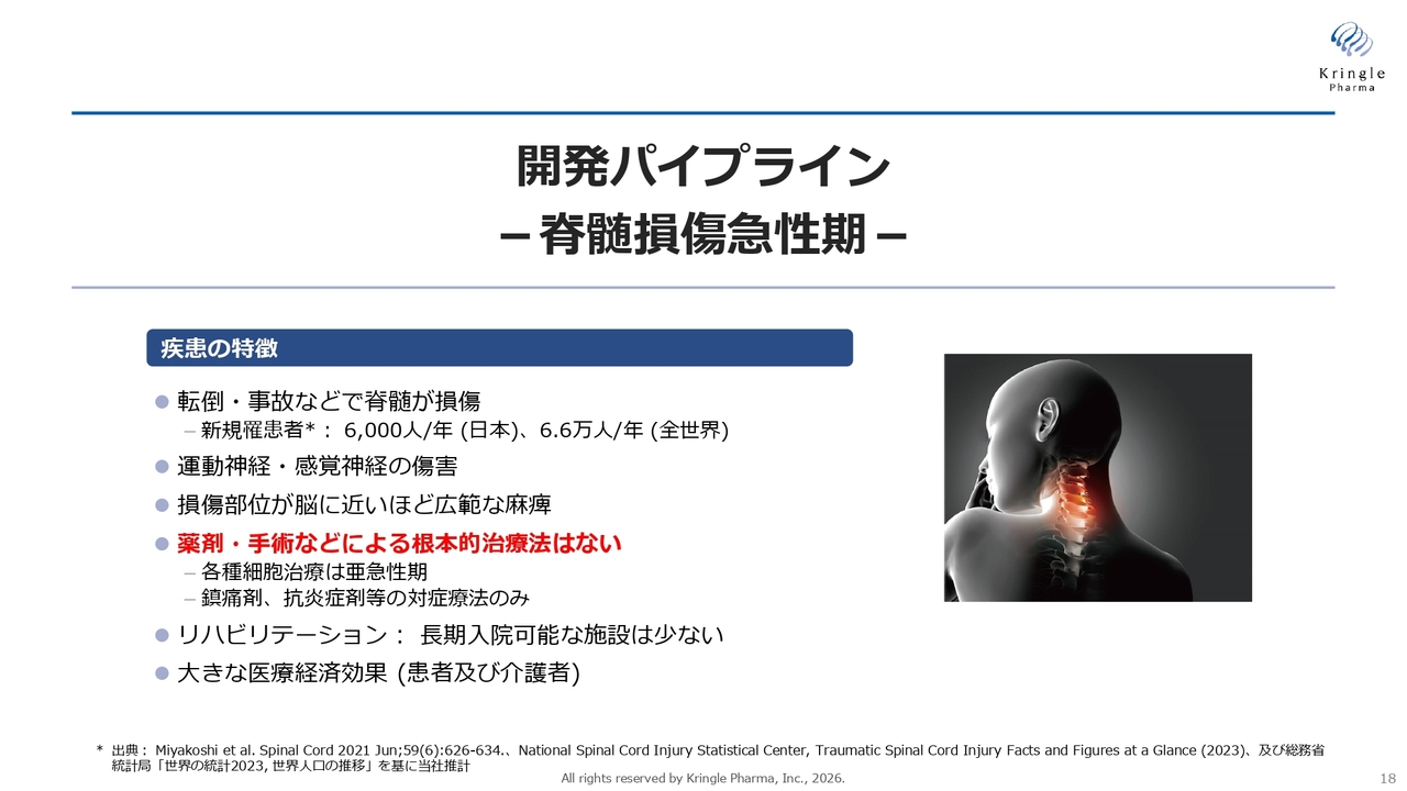 当社の既存のパイプラインの状況についてお話しします。まず、脊髄損傷急性期についてです。脊髄損傷は、国内で毎年約6,000人が新たに罹患している状況です。特に急性期においては、薬剤や手術による根本的な治療法が存在しないことが現状です。ステロイドを大量に投与する方法は薬事上認められていますが、副作用が大きく、現場の医師が使用しづらいという課題があり、実質的に有効な薬がない状態です。
