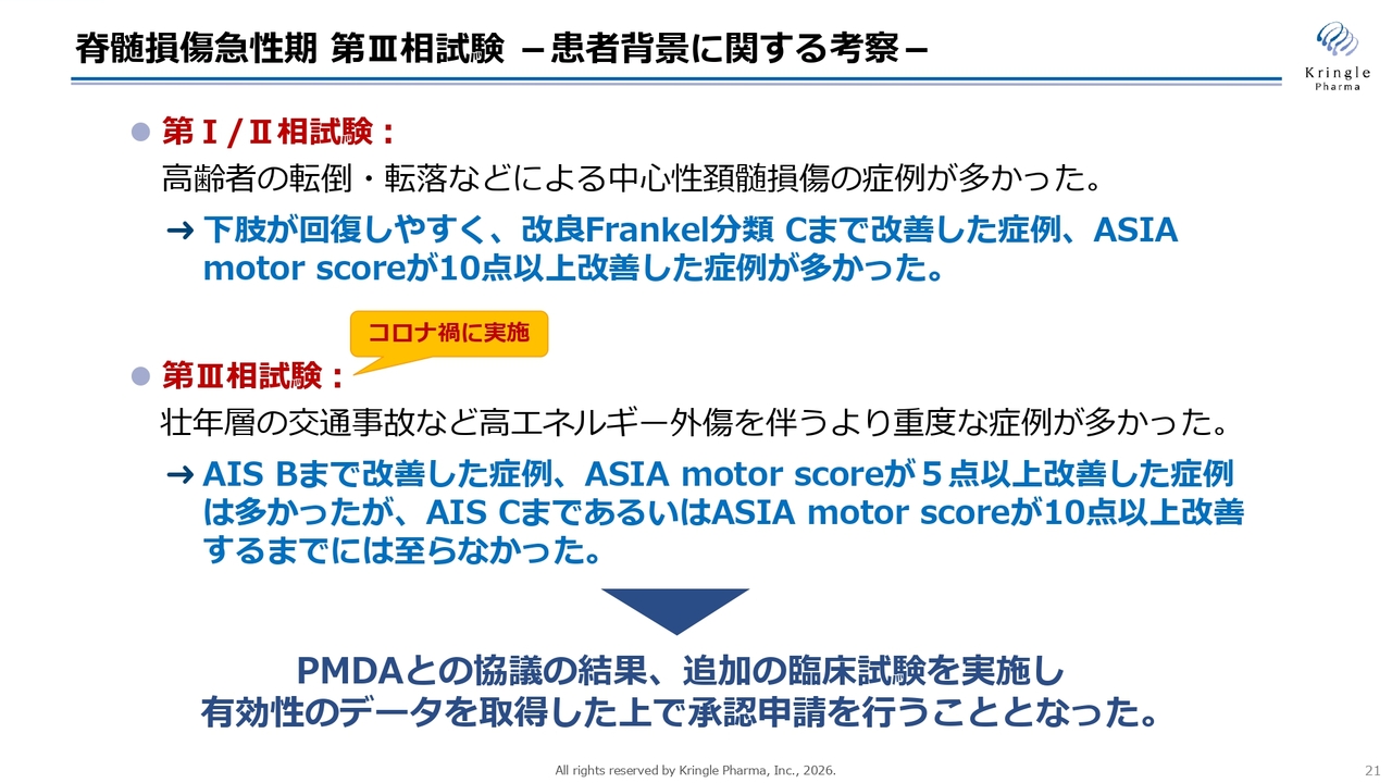 スライドは、こちらに関する考察を記載しています。第Ⅰ/Ⅱ相試験では、高齢者の転倒や転落による脊髄損傷が多く見られ、その中でも中心性頚髄損傷と呼ばれるケースが多数ありました。これらの患者さまでは、下肢が回復しやすく、重症度分類でCまで改善する症例や、motor scoreで10点以上改善する症例が非常に多かったことが特徴です。