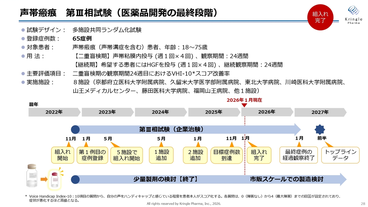 声帯瘢痕については、第Ⅲ相試験の症例組入れが終了しました。2027年に第Ⅲ相試験を終了し、これをもって承認申請に向かう方針です。
