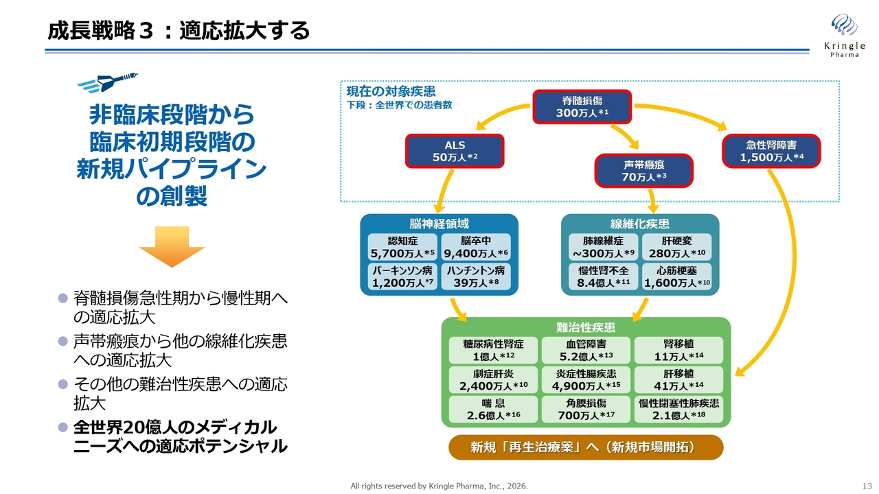 スライド右側の図は、論文として発表されている疾患を列挙したものです。当社が開発を進めている脊髄損傷、ALSに加え、脳神経領域への拡大、声帯瘢痕を起点とした非常に大きな線維化疾患の市場、さらにはその他の難治性疾患にも順次適応を拡大していきます。