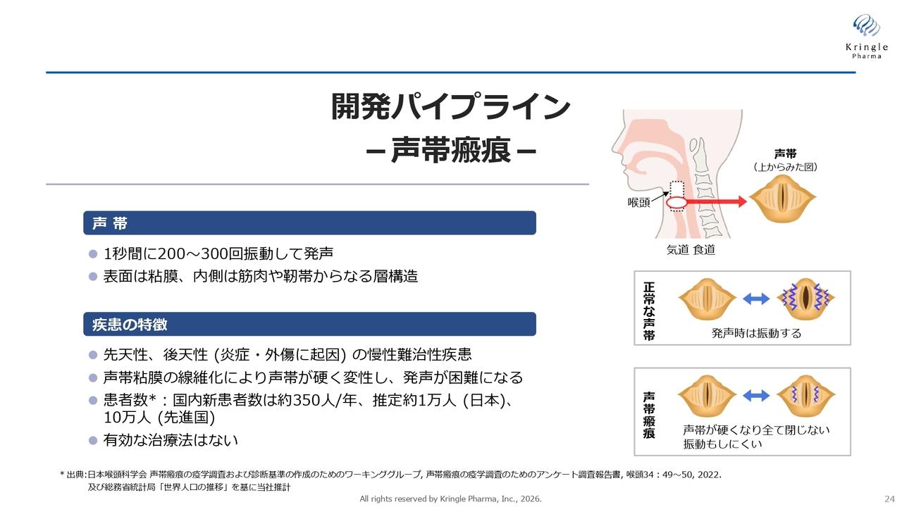 続いて、第2パイプラインの声帯瘢痕についてです。これは線維化疾患の一種であり、希少疾患に分類されます。声を出すための声帯は、非常に高速で振動し声を生み出しています。この声帯がなんらかの原因で線維化し硬くなると、正常に振動できなくなり、結果として声が出にくくなり、重症になると声が出なくなる疾患です。