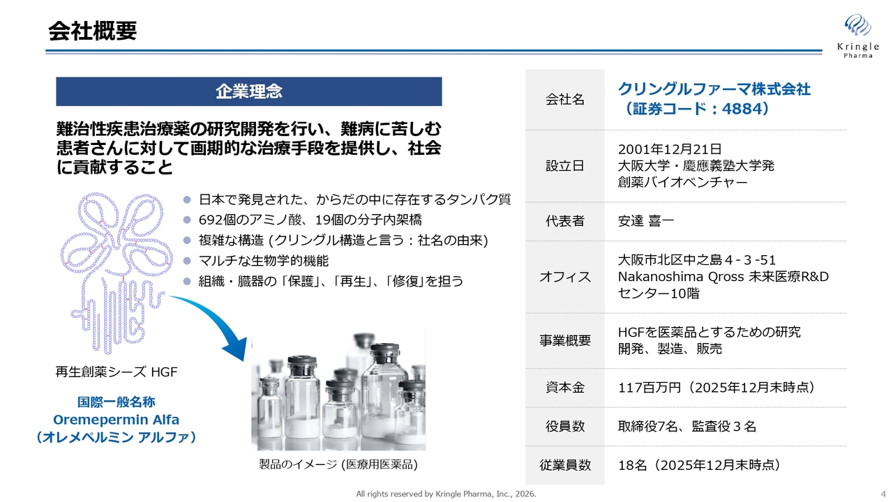 会社概要です。当社は「難治性疾患治療薬の研究開発を行い、難病に苦しむ患者さんに対して画期的な治療手段を提供し、社会に貢献すること」を企業理念とする大学発の創薬バイオベンチャーです。