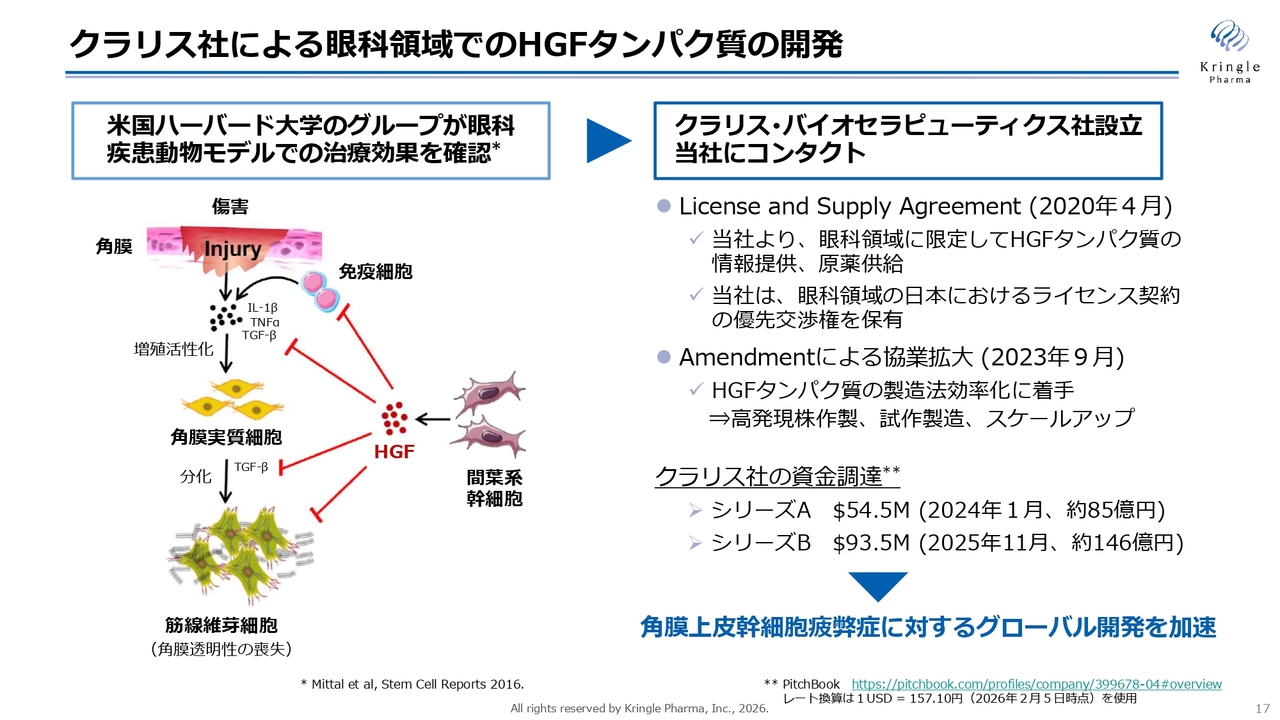 クラリス社は、眼科領域に特化してHGFタンパク質を開発している会社ですが、このように2度にわたる大型資金調達に成功していることから、HGFのポテンシャルが海外の投資家に適切に理解され、高く評価されていると考えられます。