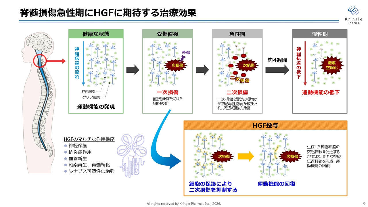 HGFには多面的な作用があります。神経保護、抗炎症作用、血管新生、軸索再生など、これらの多面的な作用が相まって、二次損傷の拡大を抑えることが動物モデルでも確認されています。二次損傷を抑えることができれば損傷範囲を小さくできるため、患者さまの予後や運動機能の回復が期待できると考えられます。