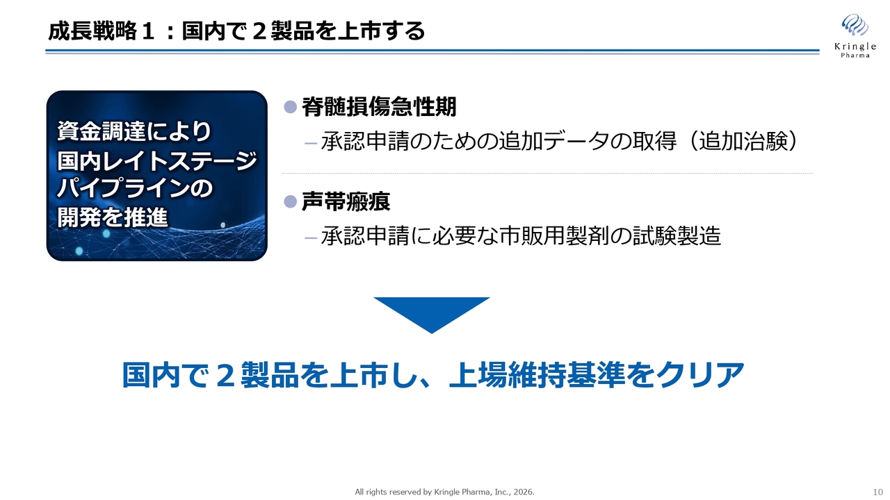 まず、1本目の矢についてです。国内で2製品を上市するという目標に向けて、現在国内で第Ⅲ相試験の段階にある2つのパイプライン、すなわち脊髄損傷急性期と声帯瘢痕について、着実に開発を進め、承認を取得することが非常に重要な成長戦略となります。