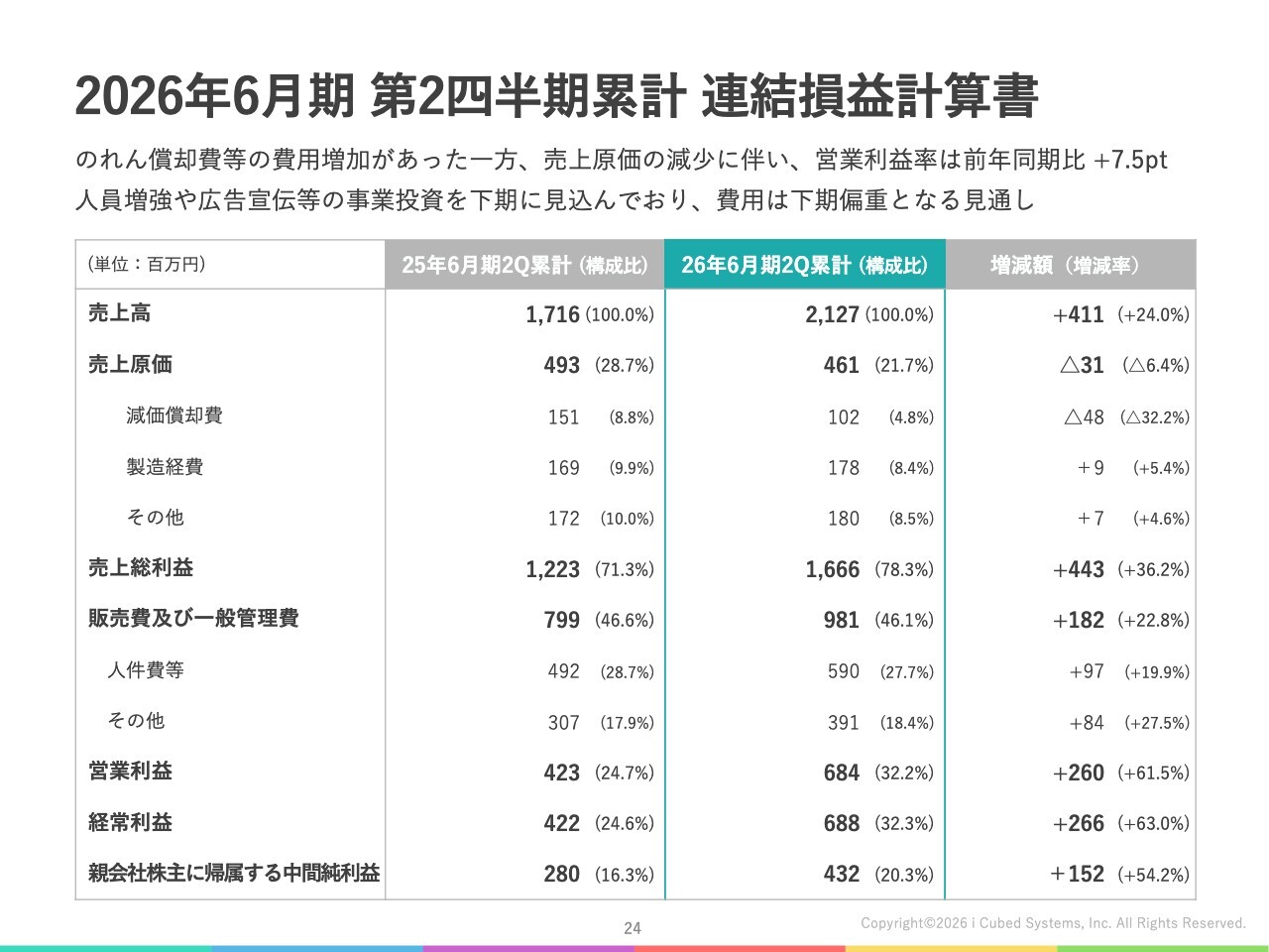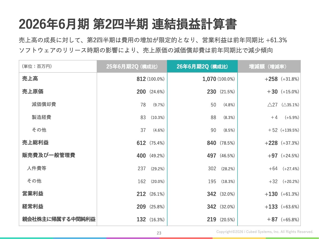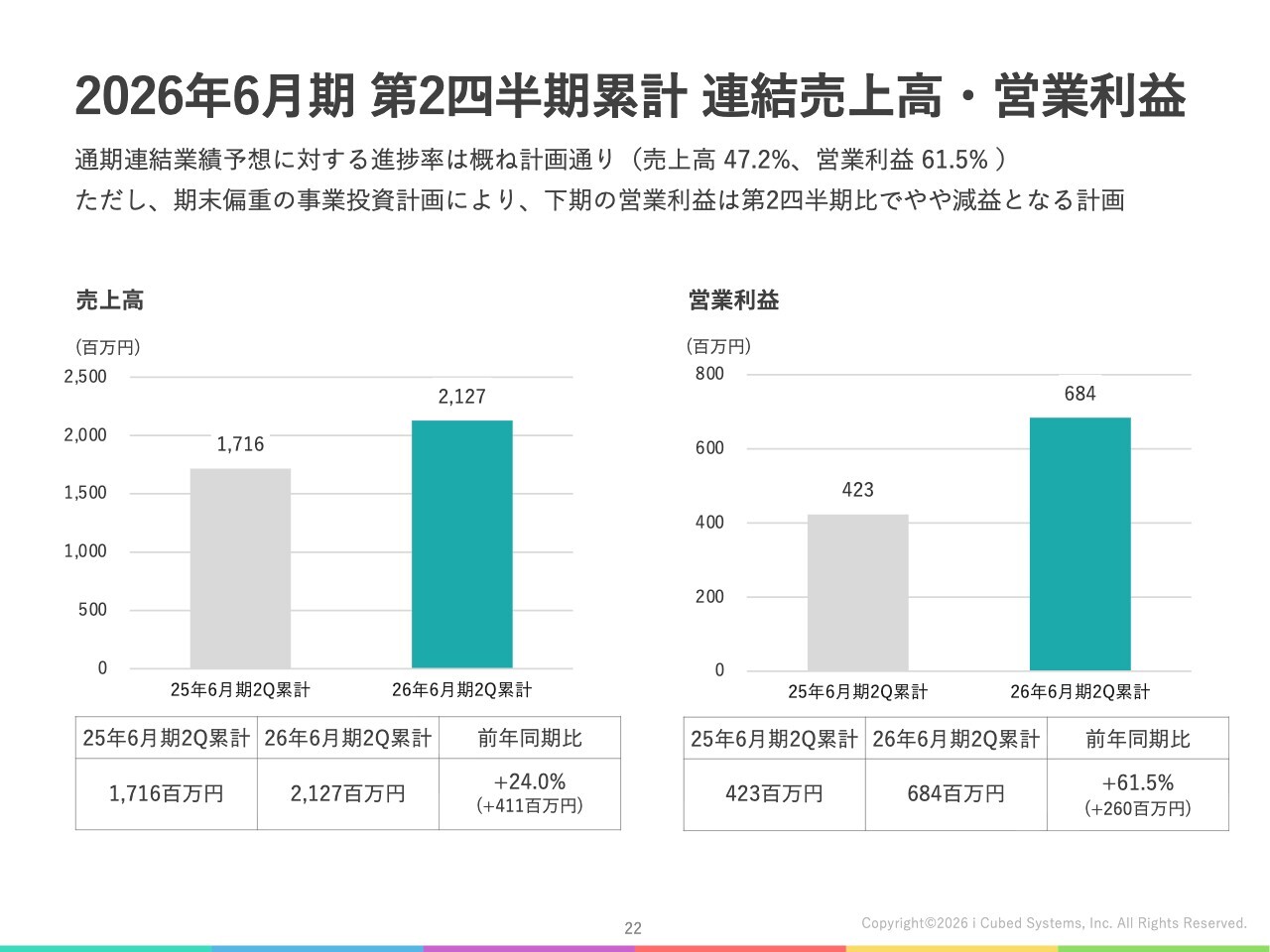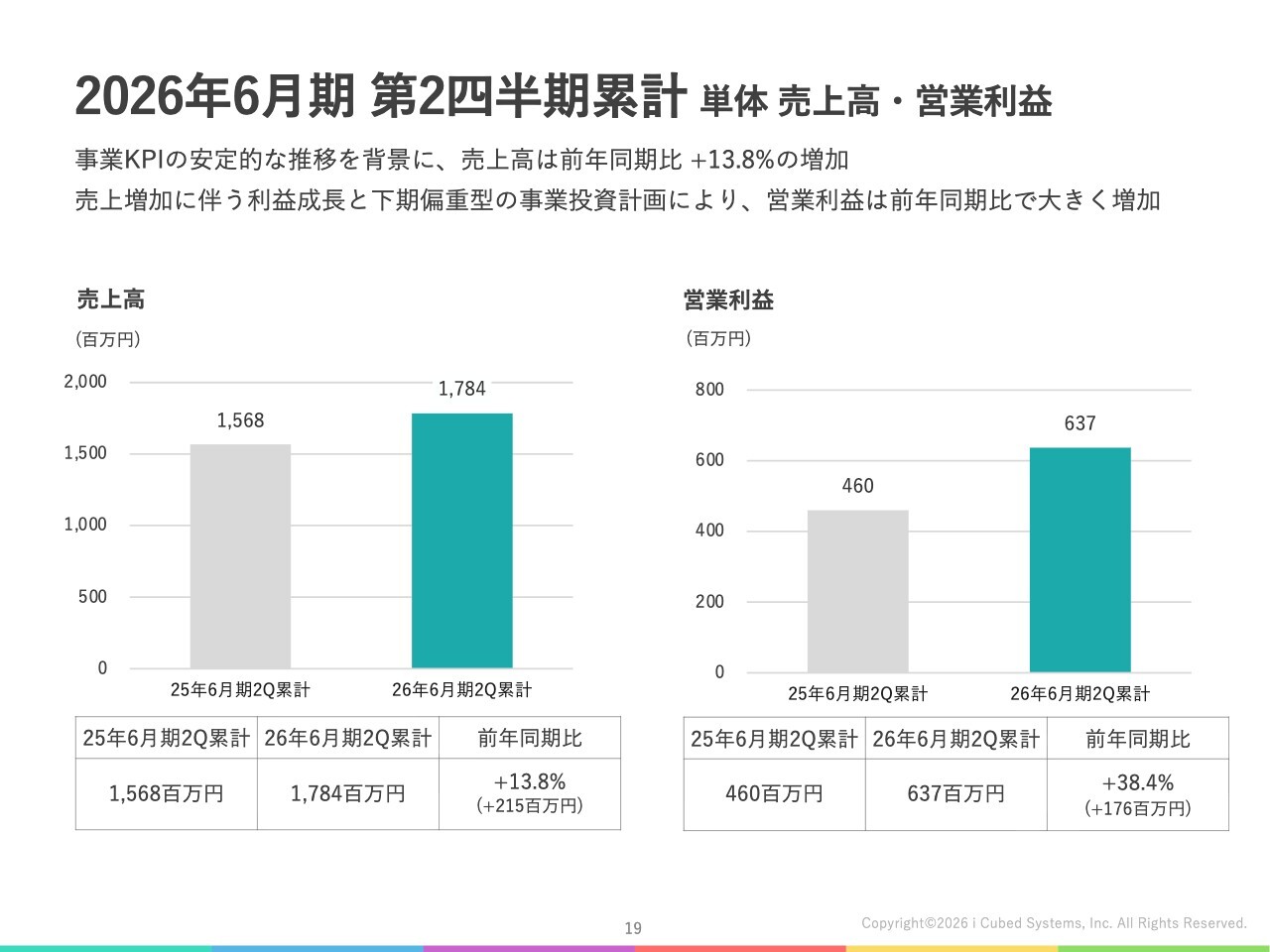 このような結果、親会社であるアイキューブドシステムズ単体の第2四半期業績は、売上高17億8,400万円、営業利益6億3,700万円となりました。
