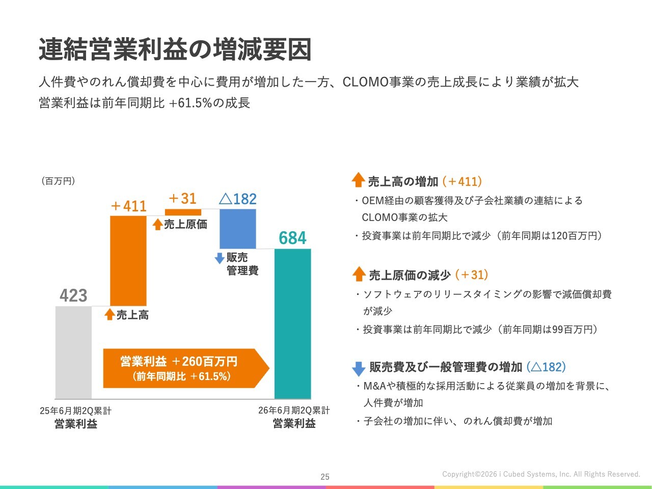 連結営業利益の増減要因についてです。主な増加要因は、CLOMO事業の売上拡大によるものです。一方で、人件費やのれん償却費を中心に費用が増加しましたが、売上成長がこれらを吸収し、営業利益は前年同期比で61.5パーセント増加しました。