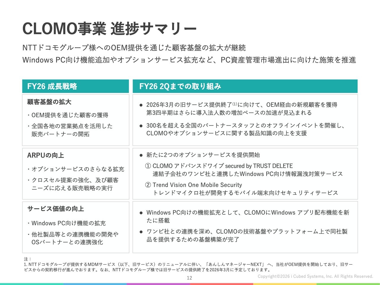 1点目の「顧客基盤の拡大」についてです。NTTドコモグループさまへのOEM提供を通じた顧客獲得が順調に進み、導入法人数は増加基調にあります。第3四半期には、旧サービス提供終了に伴う駆け込み需要が発生すると見込まれ、導入ペースのさらなる加速を期待しています。