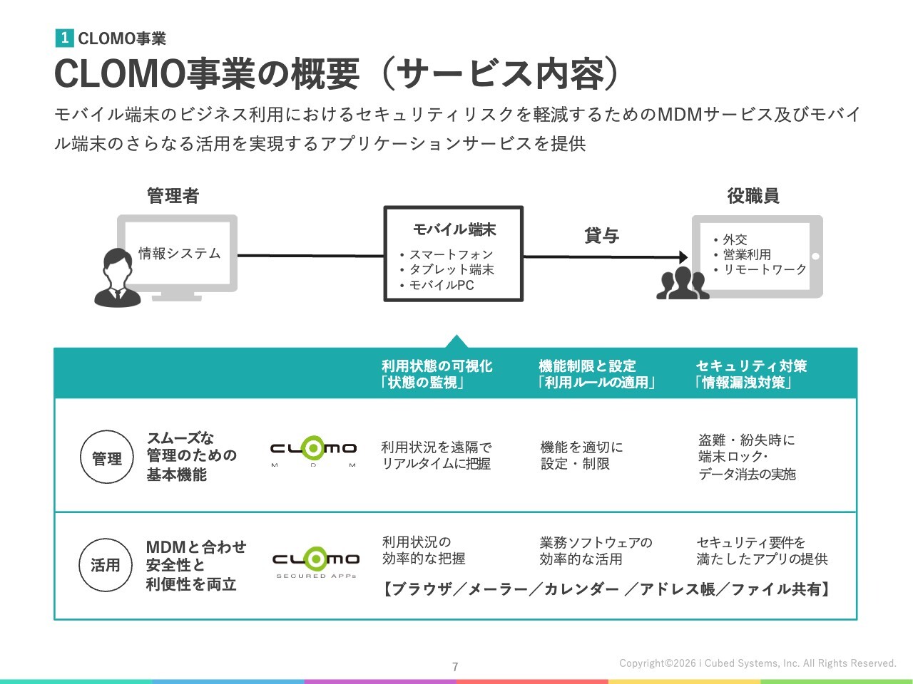 このように、CLOMO事業では企業がモバイル端末を安心・安全に業務で活用できる基盤となるサービスを提供しています。