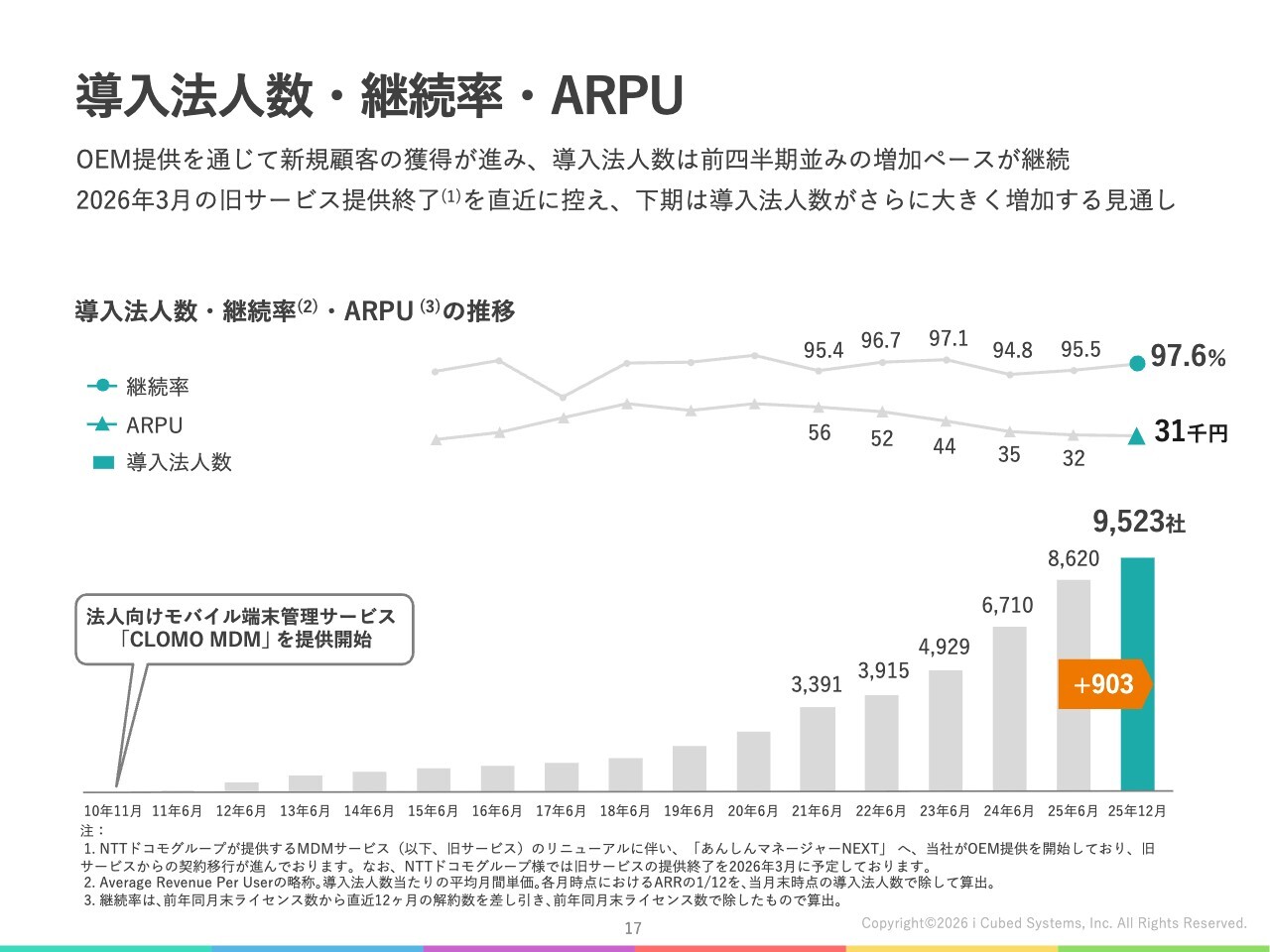 導入法人数についてです。スライドの下部にある棒グラフに示しているとおり、2025年12月末時点の導入法人数は9,523社となりました。NTTドコモグループさまへのOEM提供を通じた新規顧客の獲得が引き続き順調に進んでおり、この半年間で903社の純増となっています。