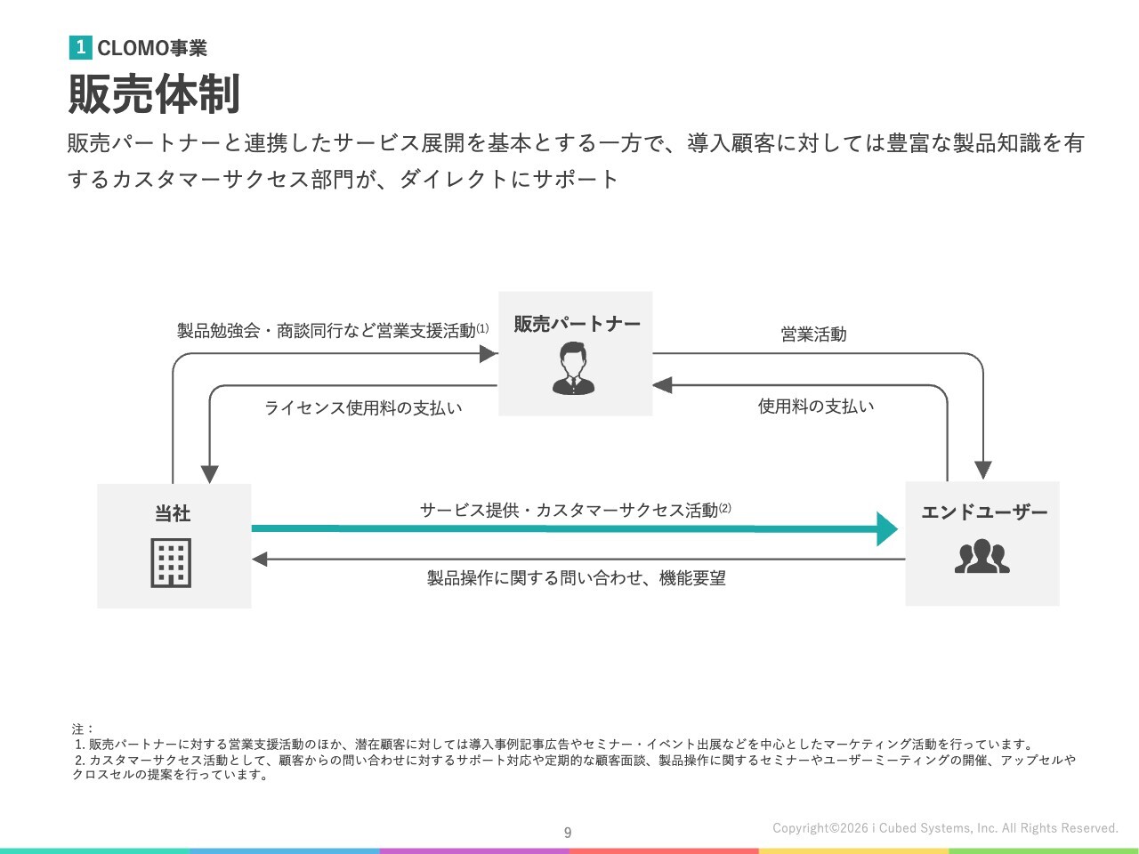また、全国の営業拠点を活用した販売パートナーの開拓や、パートナー向けオフラインイベントの開催を通じて、「CLOMO」およびオプションサービスに関する製品理解の向上にも取り組んでいます。