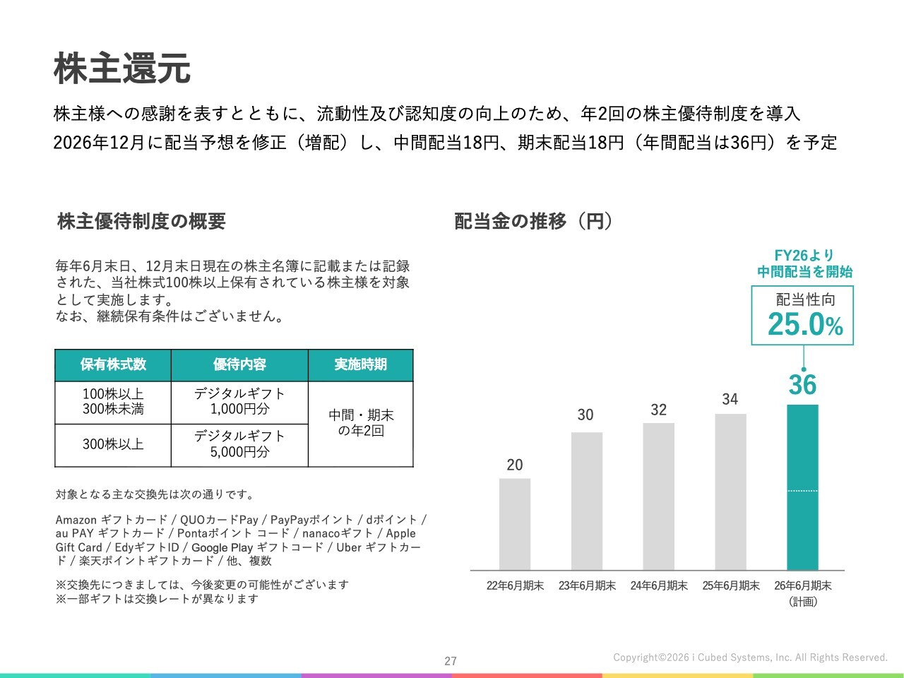 配当については、当社は上場以来継続して配当を行っており、今期より新たに中間配当を開始しています。期初計画では、中間配当と期末配当をそれぞれ17円と予定していましたが、昨年末に増配を決定し、それぞれ18円に修正しました。