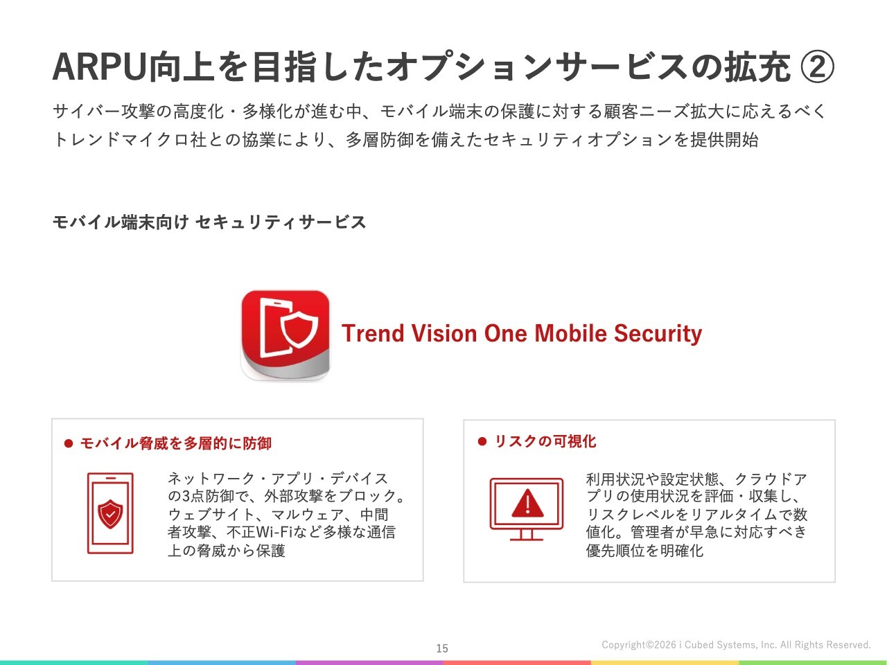 1つ目は、連結子会社のワンビ社と連携して開発した「Windows PC」向けの情報漏洩対策サービス「CLOMO アドバンスドワイプ secured by TRUST DELETE」です。2つ目は、トレンドマイクロ株式会社が開発したモバイル端末向けのセキュリティサービス「Trend Vision One Mobile Security」です。
