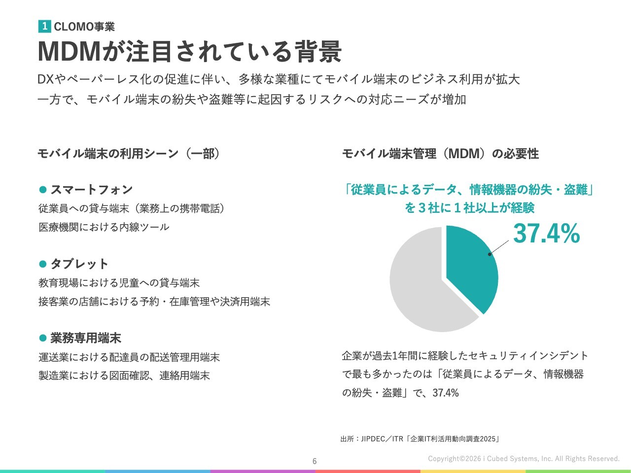CLOMO事業の主力製品は、モバイル端末管理を行うMDM製品「CLOMO MDM」です。まず、なぜMDMが必要とされ注目を集めているのか、その背景についてご説明します。