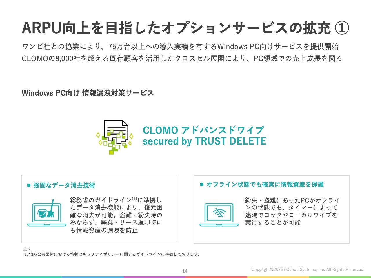 まず、「Windows PC」向けの情報漏洩対策サービスについてご説明します。本サービスは、連結子会社であるワンビ社との協業により提供を開始したもので、これまでに75万台以上の導入実績があります。これを「CLOMO」のオプションサービスとして展開していきます。