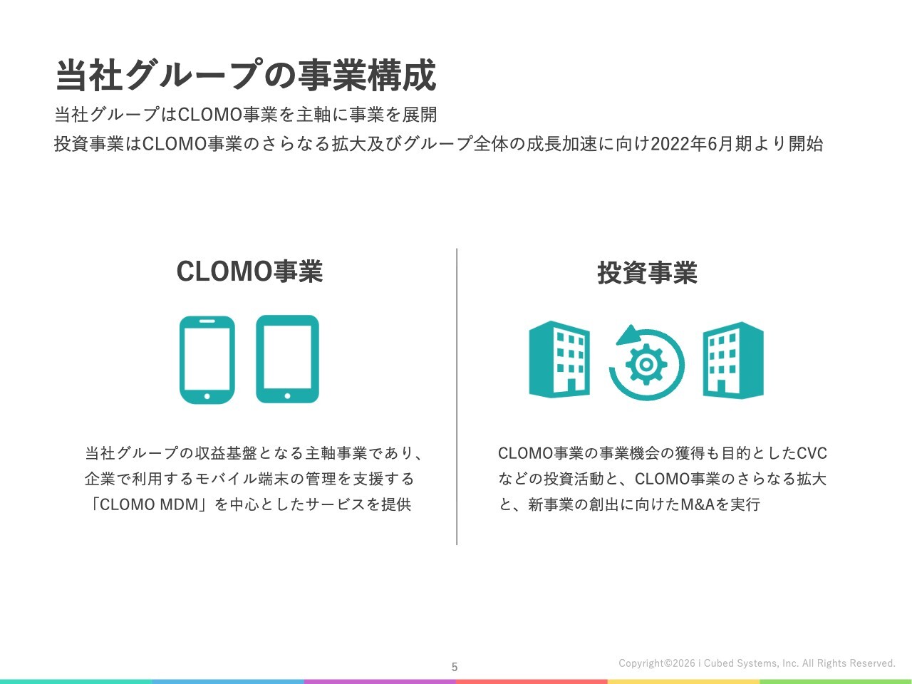 CLOMO事業は当社グループの主軸事業であり、企業向けにソフトウェアをクラウドで提供するいわゆるSaaS事業です。投資事業については、CLOMO事業のさらなる成長機会の獲得を目的として、スタートアップへの投資を中心に取り組んでいます。