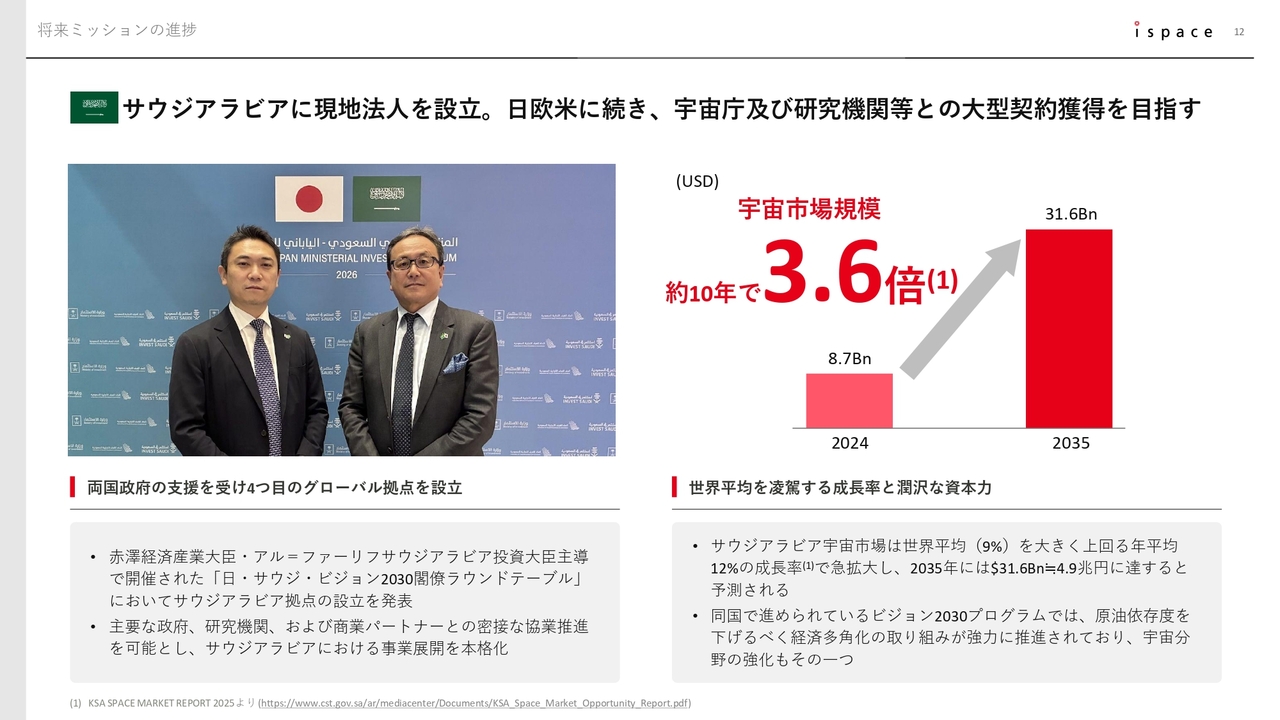 また、サウジアラビアには、2030年に向けた国としての指針(Saudi Vision 2030)があります。2026年1月に、赤澤経済産業大臣を中心とする日本の訪問団がリヤドを訪れました。ispaceも同行し、私も参加しましたが、大変注目されていました。現在、日本とサウジアラビアの間では協力を進めようという動きがあり、両国の関係は非常に強固です。
