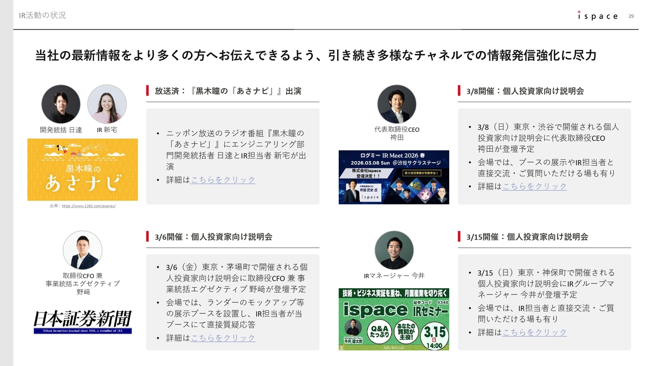 こちらに記載したのはその一例です。3月以降も個人投資家のみなさまを対象とした説明会が予定されており、CEOの袴田、CFOの野﨑、そしてIRマネージャーの今井がそれぞれ登壇する予定です。みなさまと充実したコミュニケーションを図っていきますので、ぜひご参加ください。