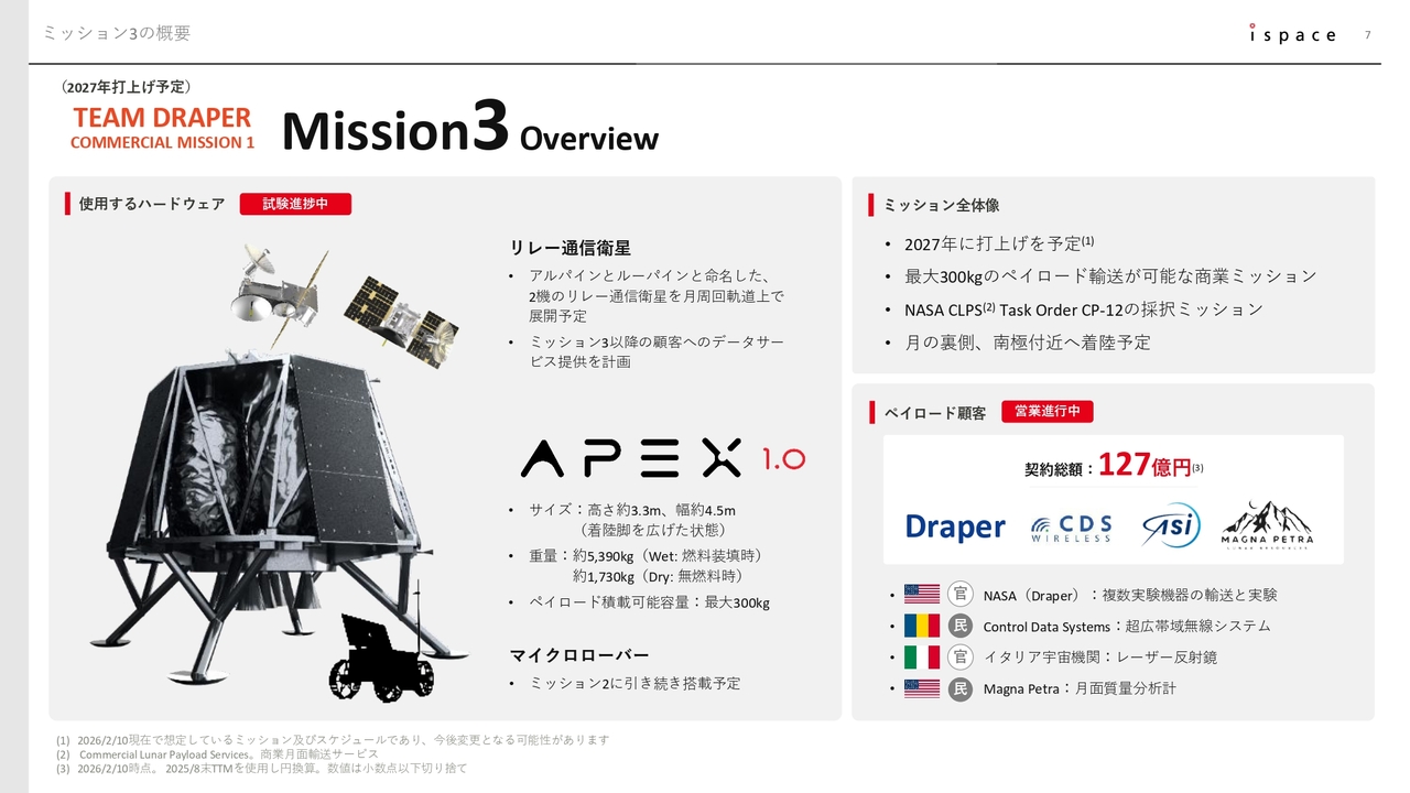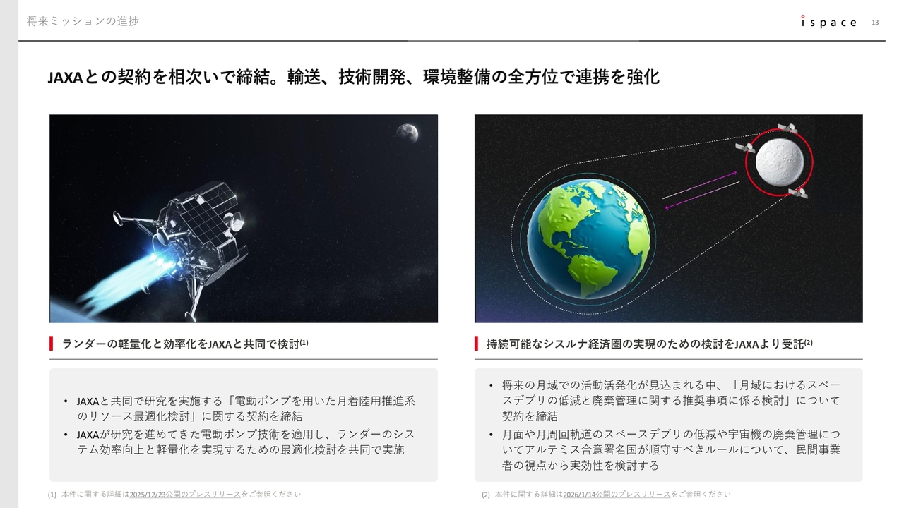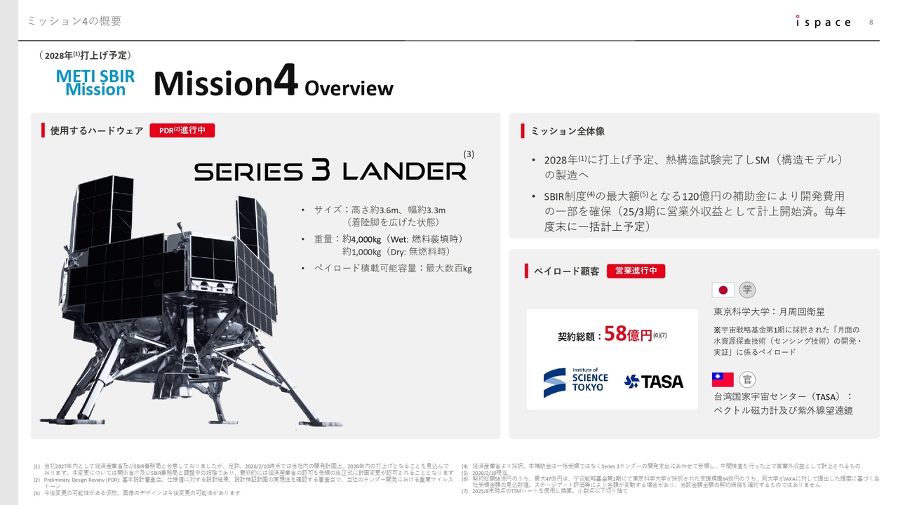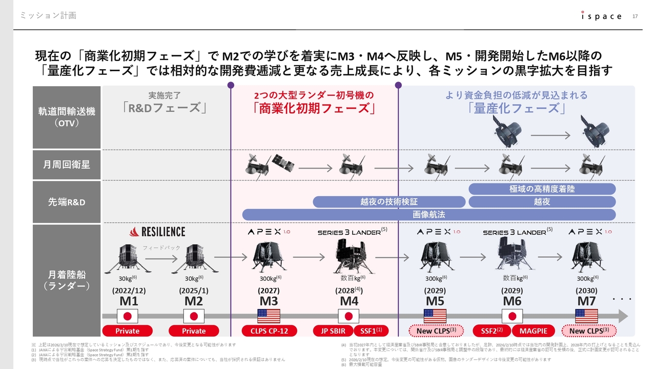 マイルストーンに話を戻すと、NASAの「CLPS(Commercial Lunar Payload Service)」をMission 5で取りたかったものの、果たせていません。その背景にはさまざまな理由がありますが、1つには当社がまだ契約を取り付けられていないこと、もう1つには、昨年、米政府によるNASAの長期的な閉鎖があったことが挙げられます。これらの事象がNASAの計画の進捗や、当社が獲得を目指している契約に遅れが生じている原因となっています。