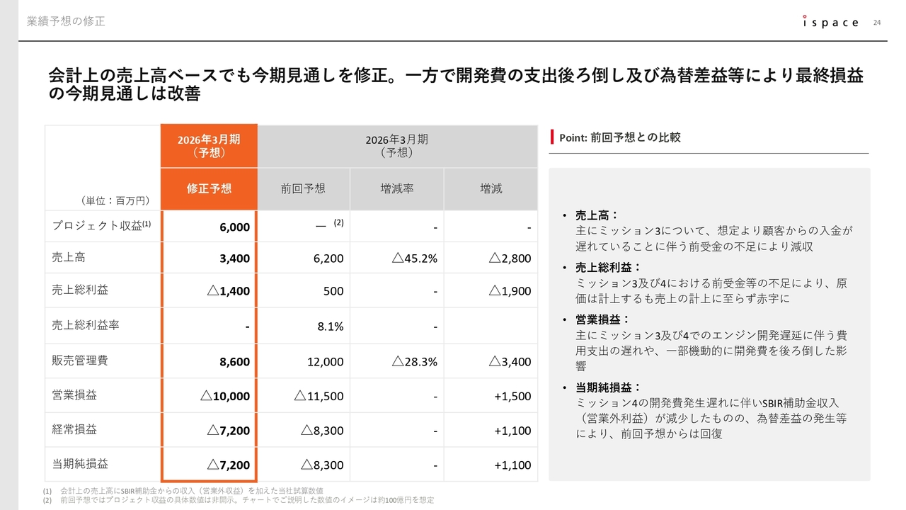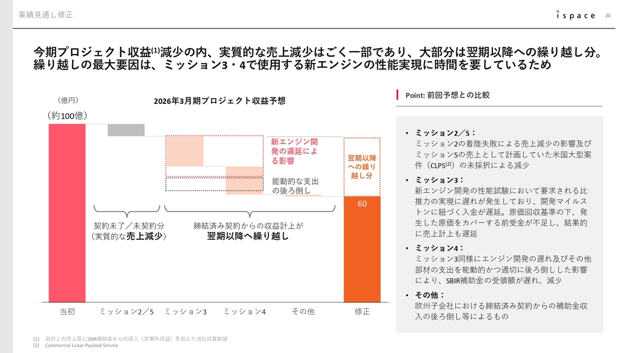 では、なぜこの繰り越しが発生したのかについてですが、Mission 3およびMission 4で共通して使用する予定の新エンジンの開発に、当初計画よりも時間を要していることが背景に挙げられます。これにより、Mission 3では開発マイルストーンにひも付くドレイパー社からの入金が遅延し、今期のプロジェクト収益が減少する見込みです。