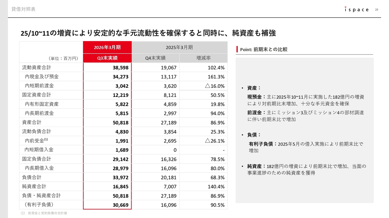 バランスシートについてです。主に第3四半期に実施した合計182億円の公募増資および第三者割当増資の影響により、資産サイドでは現預金が342億円となり、安定的な手元流動性を確保しています。また、純資産は168億円に増加し、安定的な財務基盤を構築しています。以上が財務の説明です。