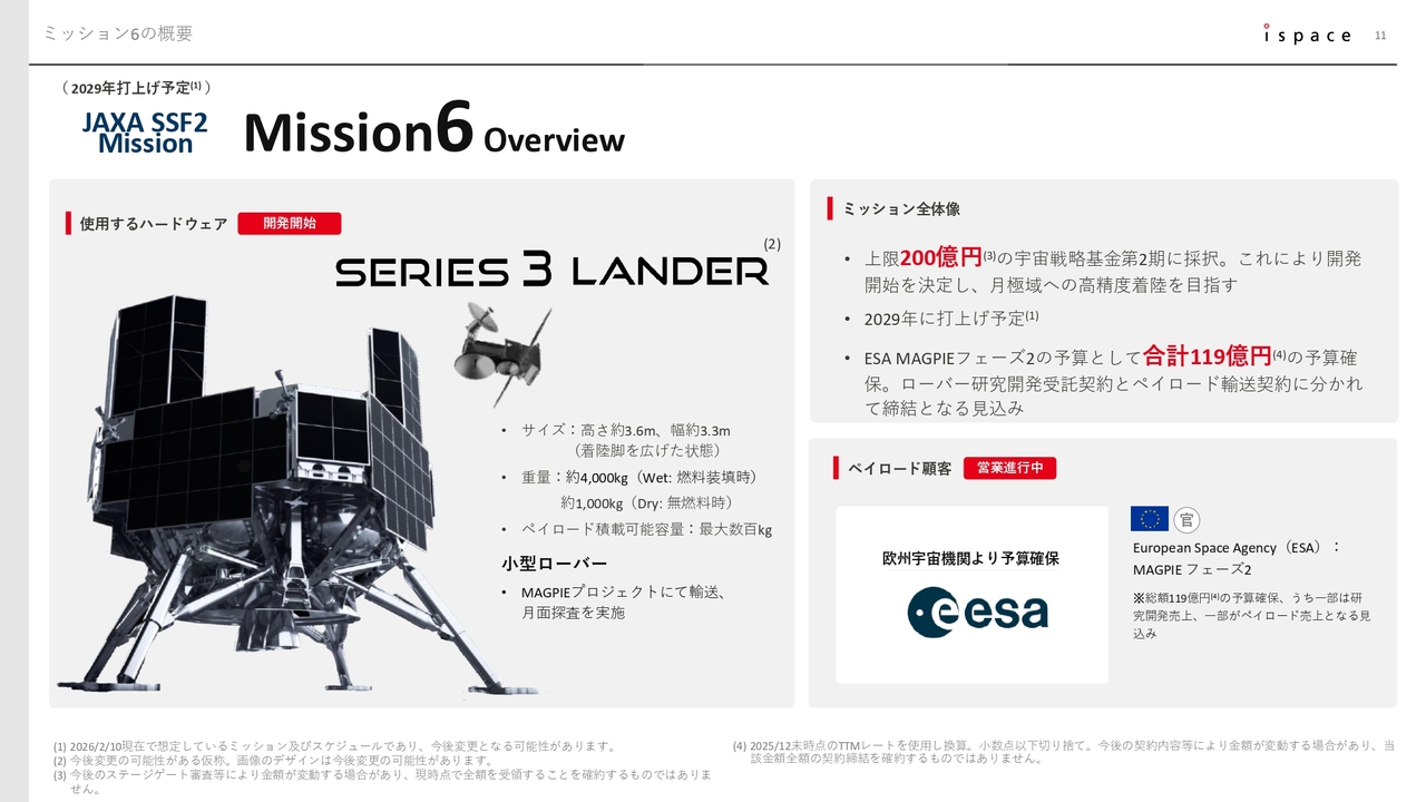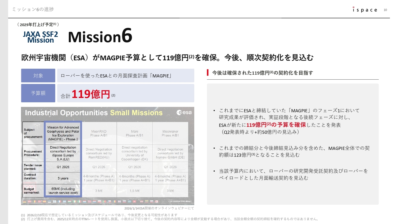 また、この採択に加えて、後ほどご報告するESA(欧州宇宙機関)からの予算確保により、Mission 6のコストはほぼカバーされる見込みであり、従来比で極めて収益性が向上するミッションになると見込んでいます。