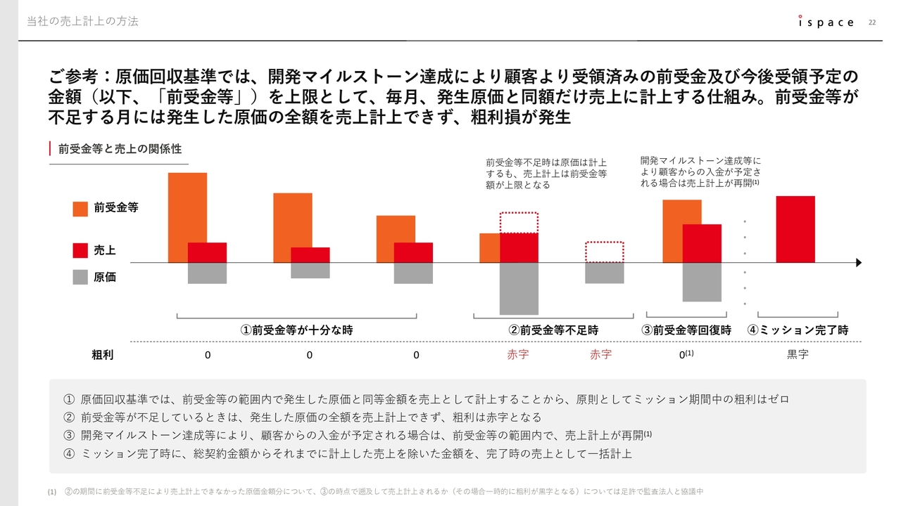 当社のMission 3およびMission 4に適用されている原価回収基準では、開発マイルストーンを達成することにより、顧客から受領した前受金および将来的に受領予定の入金額、これらを合わせて「前受金等」と呼びますが、こちらを上限として、原価に相当する売上高が計上される仕組みとなっています。