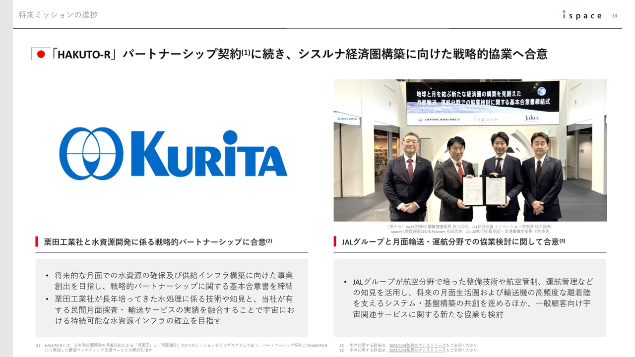 2025年12月に終了した「HAKUTO-Rプログラム」のパートナー企業とは、協賛から戦略的協業へと形を変え、関係を継続しています。栗田工業社とは月面の水資源開発に関する協業を、JALグループとは月面輸送・運航分野および個人向けのペイロード搭載など、新たなサービスの協業を進めていきます。