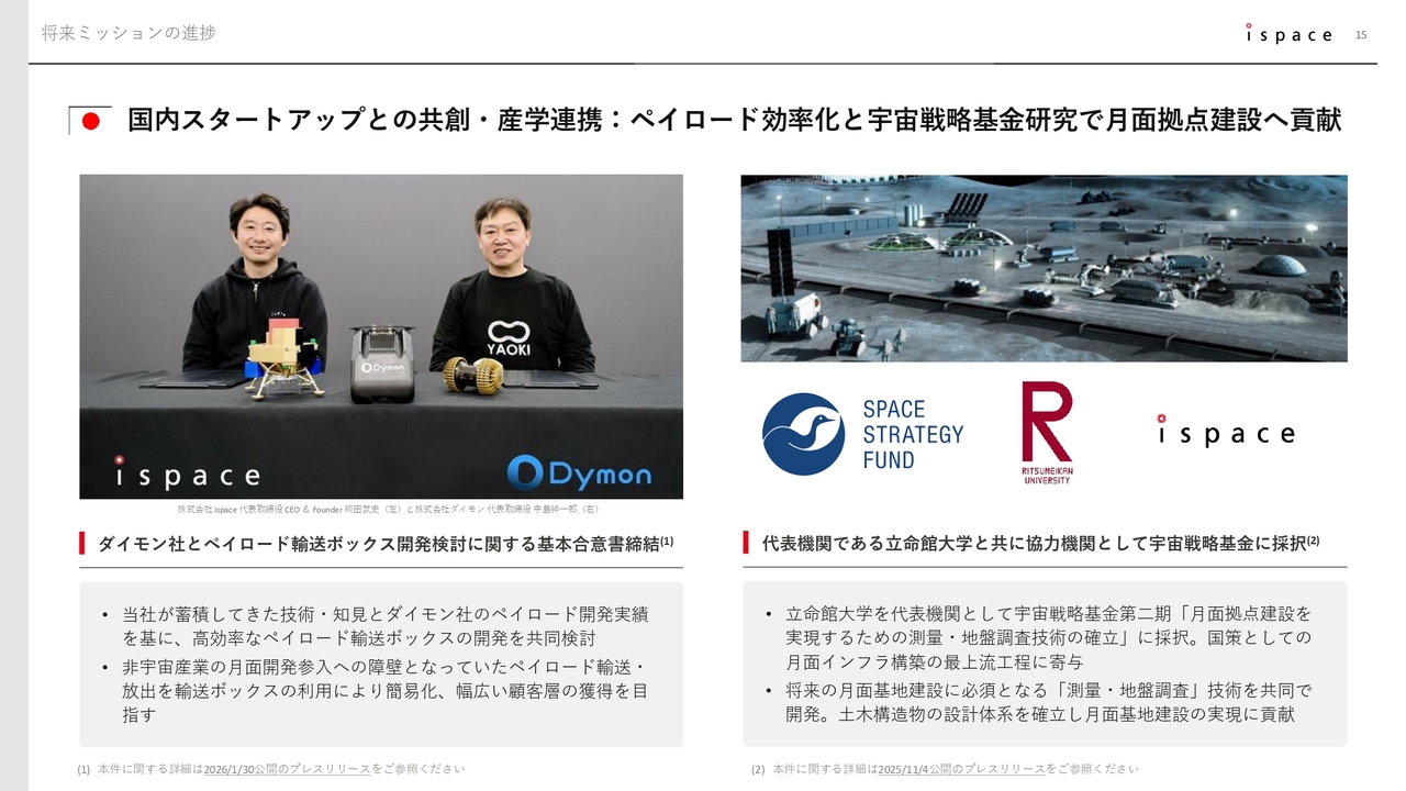 また、産学連携にも進捗があり、宇宙戦略基金事業(第二期)に採択された立命館大学と協力し、将来の月面基地建設に向けた研究を共同で実施しています。