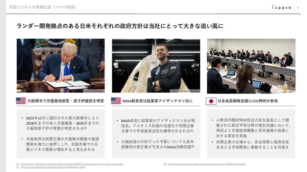 まず初めに、マクロ環境について触れたいと思います。月面ビジネスを取り巻く環境は、特に日米両国の政府方針が当社のビジネスに大きな追い風となっています。
