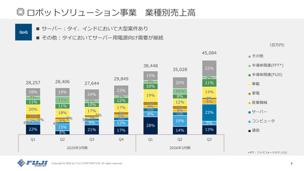 加納淳一氏:取締役専務執行役員コーポレート本部本部長の加納です。第3四半期の受注高は、ロボットソリューション事業全体で約539億円、ファスフォードテクノロジ単体で約73億円でした。