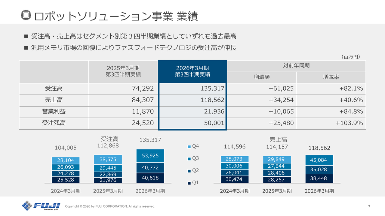 ロボットソリューション事業では、受注高は前年同期比82.1パーセント増の1,353億1,700万円、売上高は前年同期比40.6パーセント増の1,185億6,200万円で、いずれも第3四半期実績として過去最高となりました。特に受注高はこれまで過去最高だった1,063億円を約27パーセント上回る、非常に高い水準となっています。